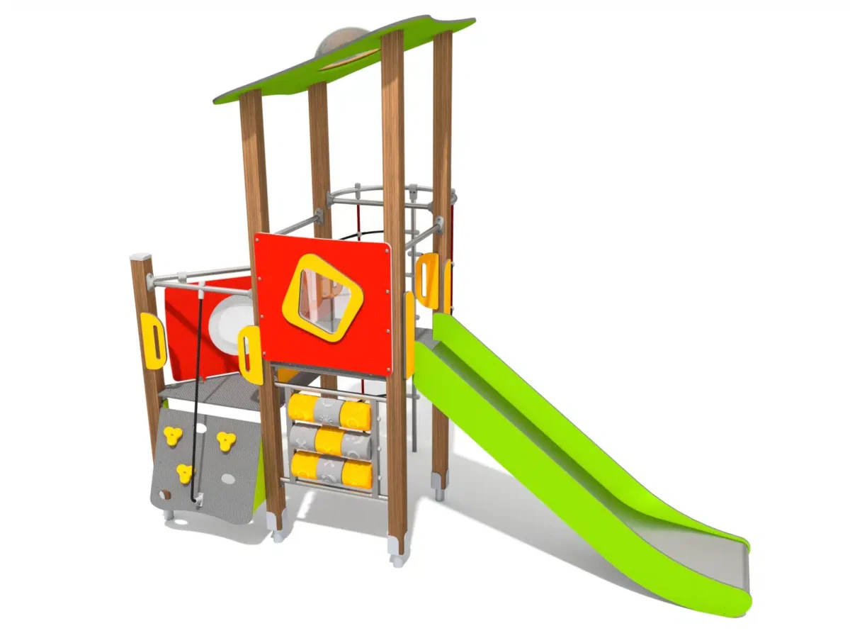 Ein hölzernes Spielplatzgebäude in Form eines Schiffes mit einem hohen Mast, Rutschen und Sand darunter. Im Hintergrund sind Bäume und ein klarer blauer Himmel zu sehen.