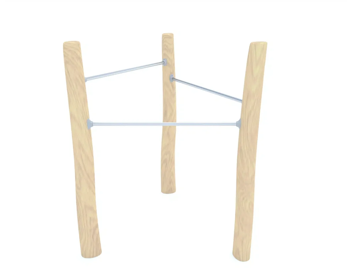 Ein junges Mädchen klettert lächelnd auf einen runden Spielplatz aus Metall und Seilen, während im Hintergrund Bäume und Grünflächen zu sehen sind.