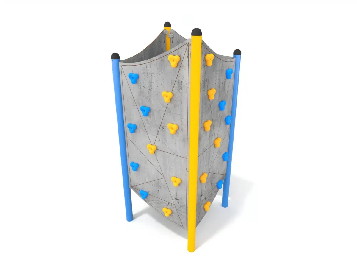 Ein junges Mädchen klettert lächelnd auf einen runden Spielplatz aus Metall und Seilen, während im Hintergrund Bäume und Grünflächen zu sehen sind.