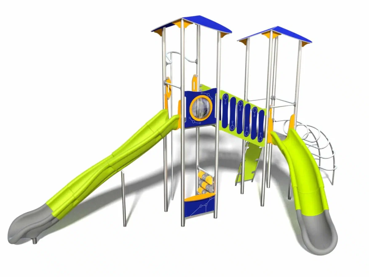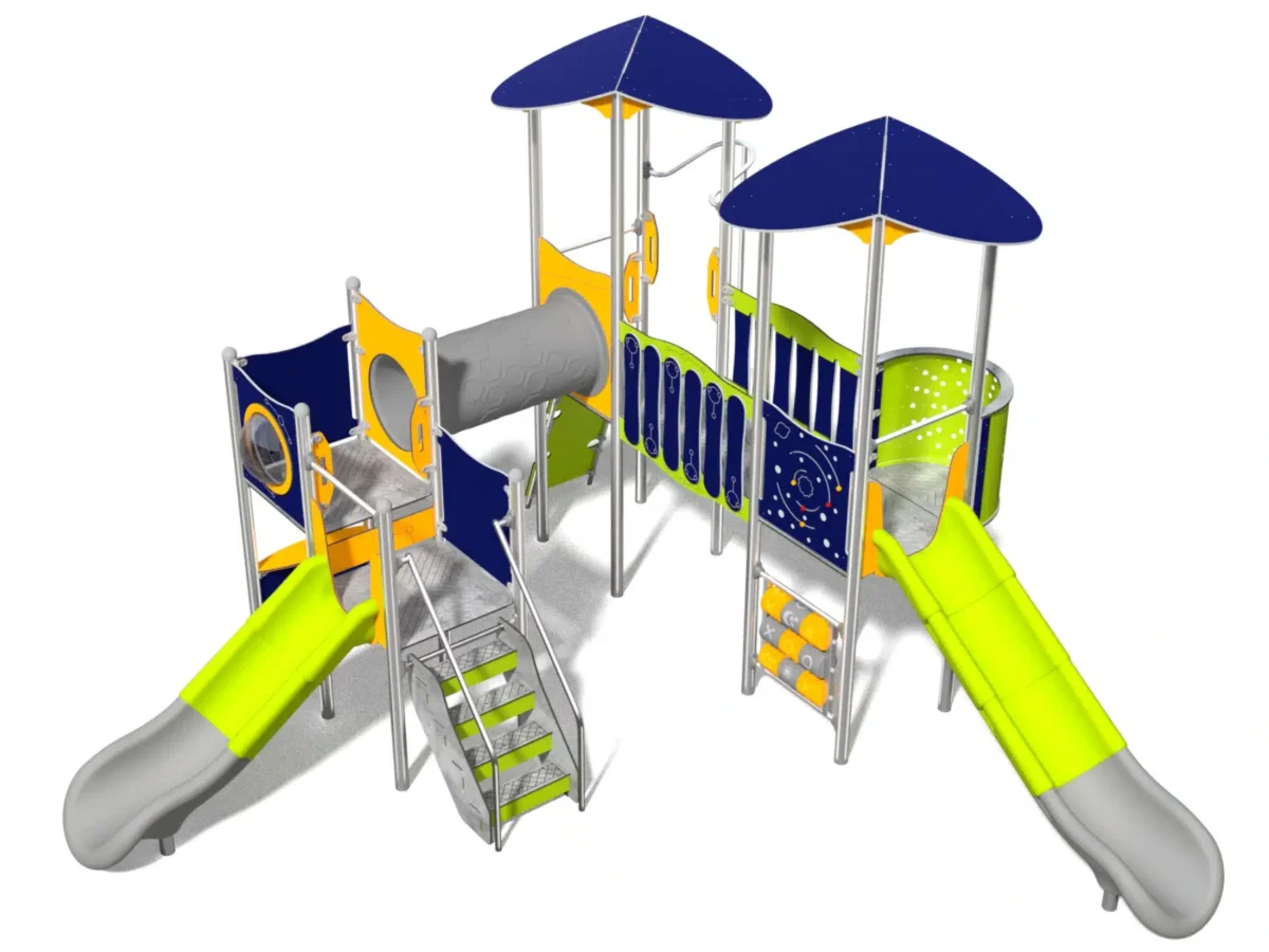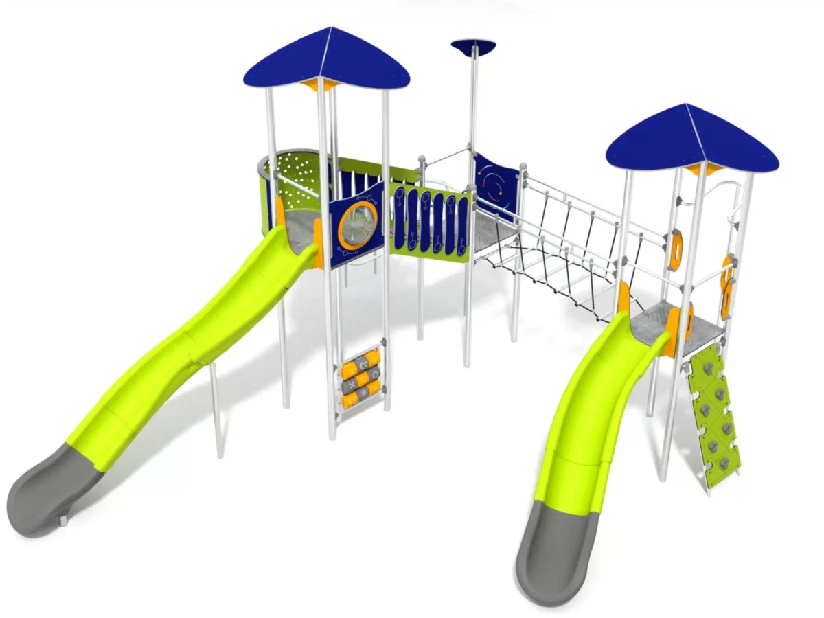 Ein hölzernes Spielplatzgebäude in Form eines Schiffes mit einem hohen Mast, Rutschen und Sand darunter. Im Hintergrund sind Bäume und ein klarer blauer Himmel zu sehen.