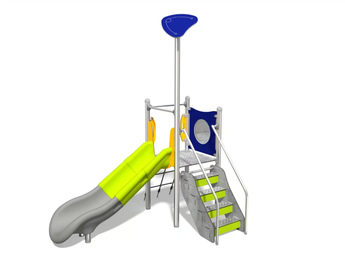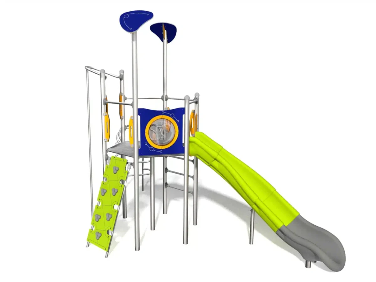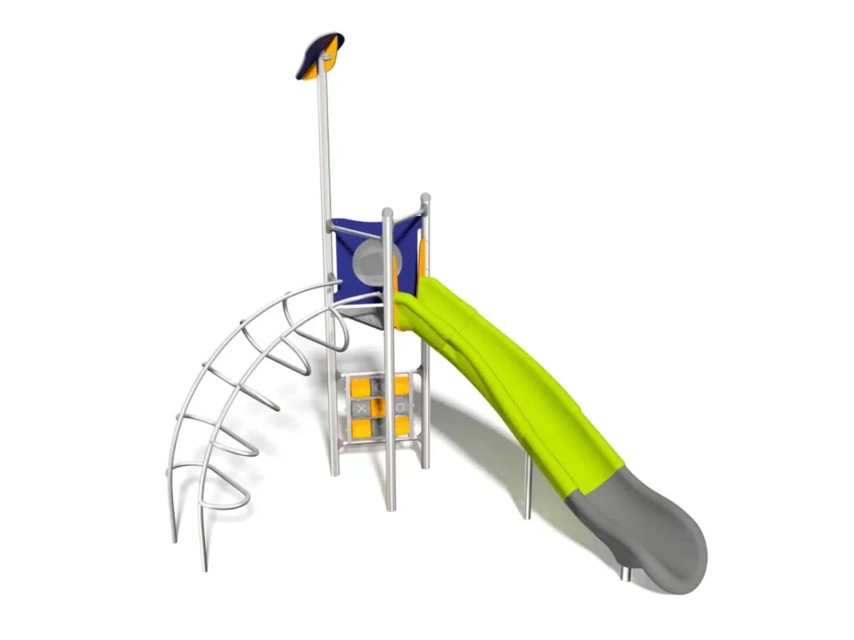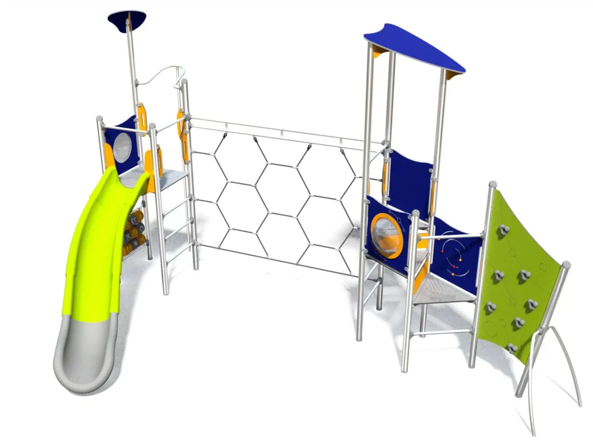 Ein junges Mädchen klettert lächelnd auf einen runden Spielplatz aus Metall und Seilen, während im Hintergrund Bäume und Grünflächen zu sehen sind.