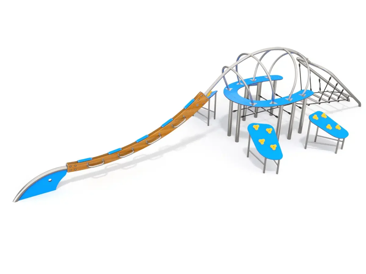 Ein hölzernes Spielplatzgebäude in Form eines Schiffes mit einem hohen Mast, Rutschen und Sand darunter. Im Hintergrund sind Bäume und ein klarer blauer Himmel zu sehen.