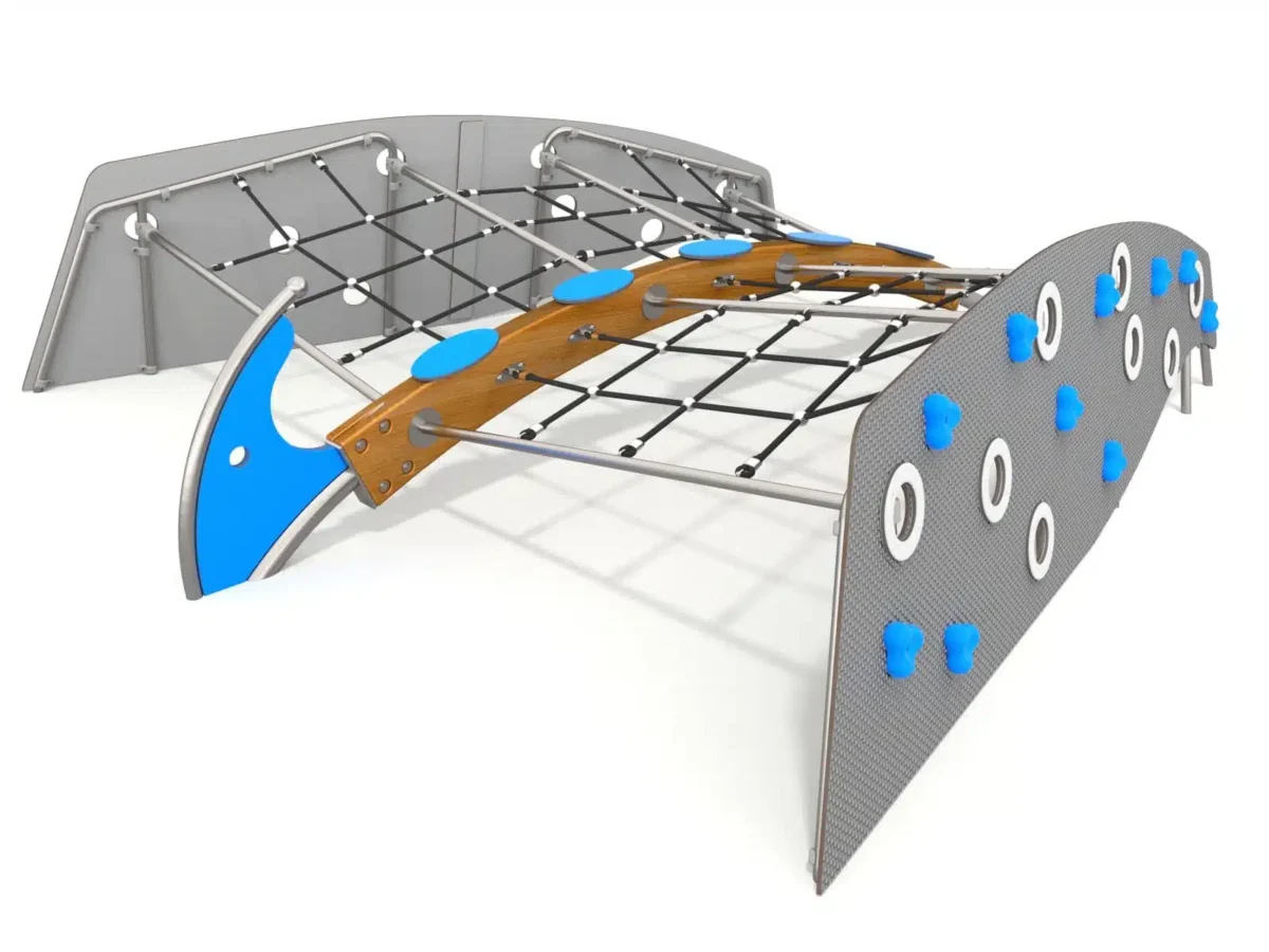 Ein junges Mädchen klettert lächelnd auf einen runden Spielplatz aus Metall und Seilen, während im Hintergrund Bäume und Grünflächen zu sehen sind.
