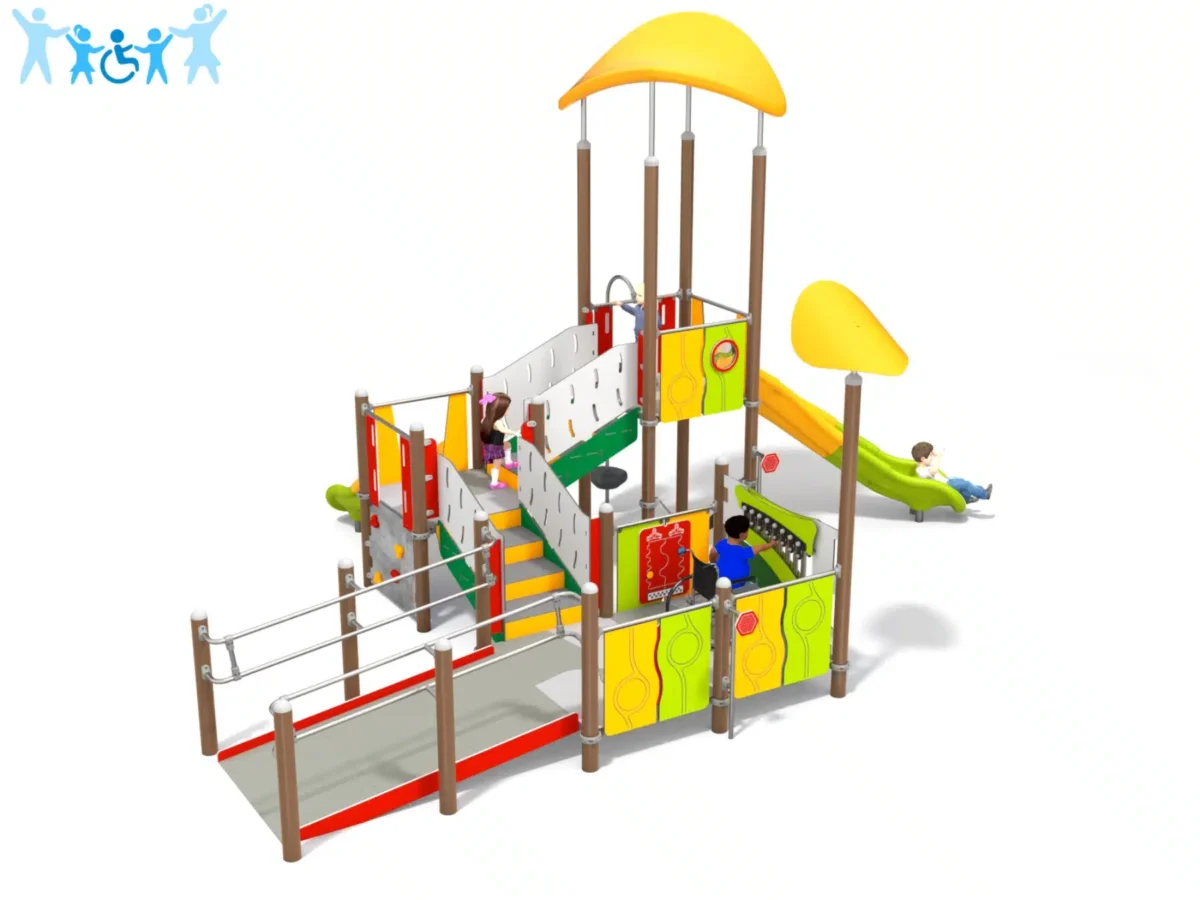 Ein junges Mädchen klettert lächelnd auf einen runden Spielplatz aus Metall und Seilen, während im Hintergrund Bäume und Grünflächen zu sehen sind.