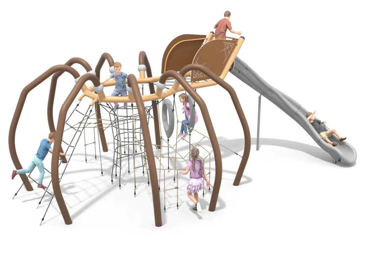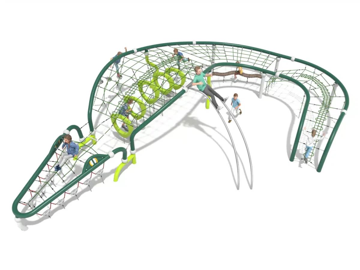 Ein junges Mädchen klettert lächelnd auf einen runden Spielplatz aus Metall und Seilen, während im Hintergrund Bäume und Grünflächen zu sehen sind.