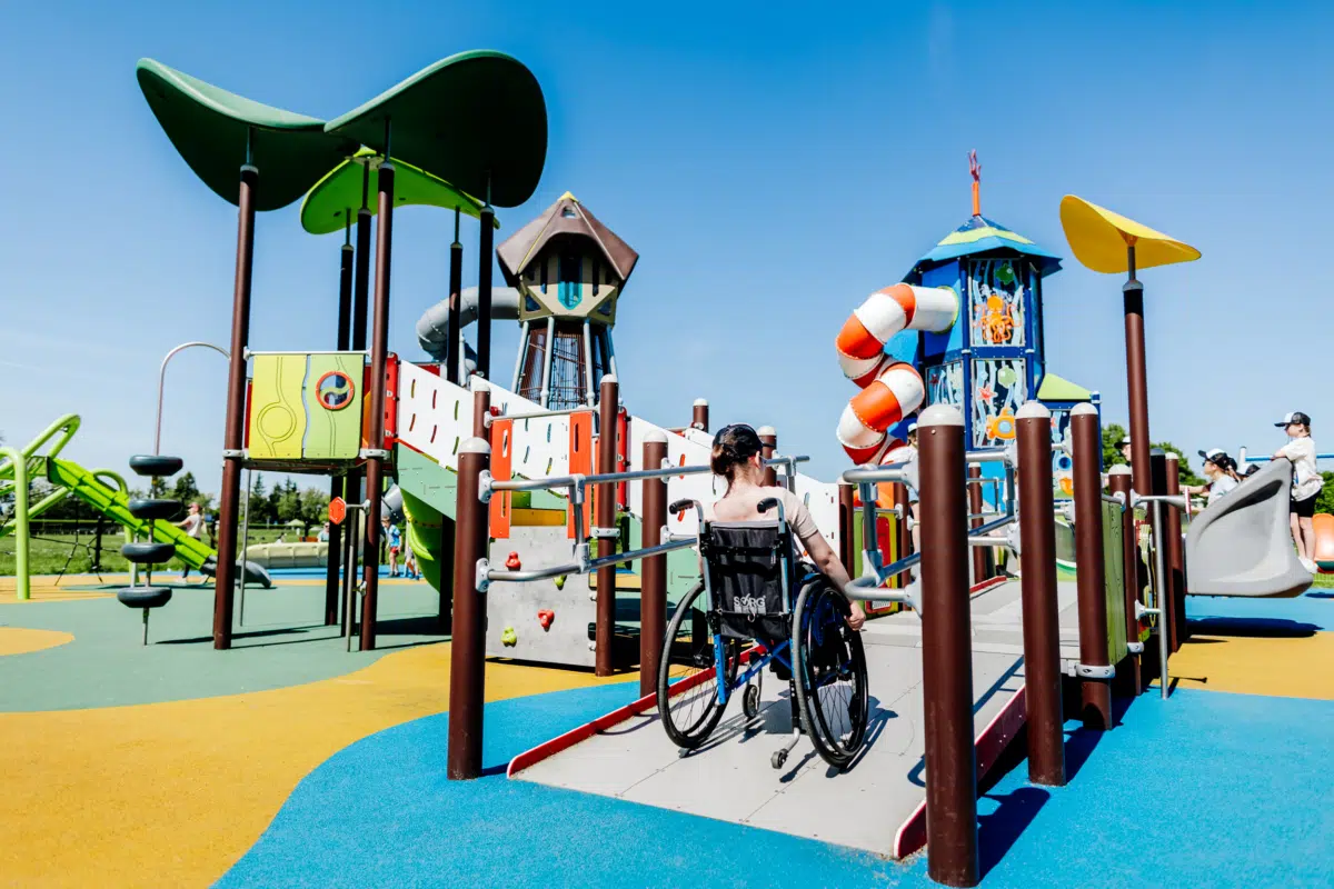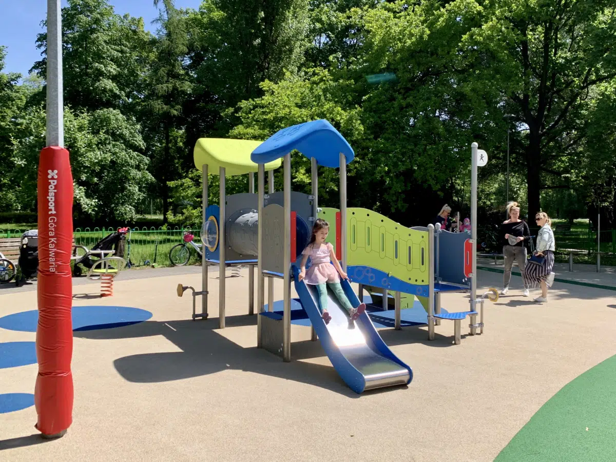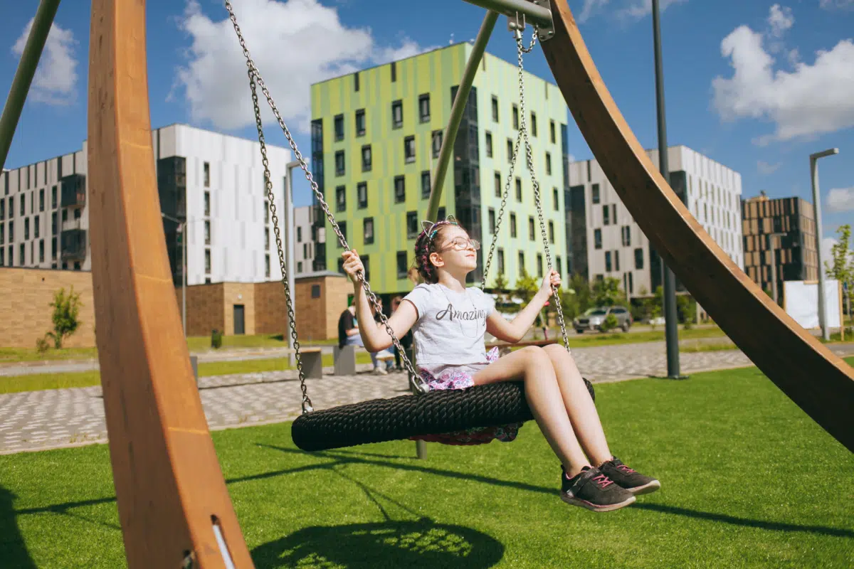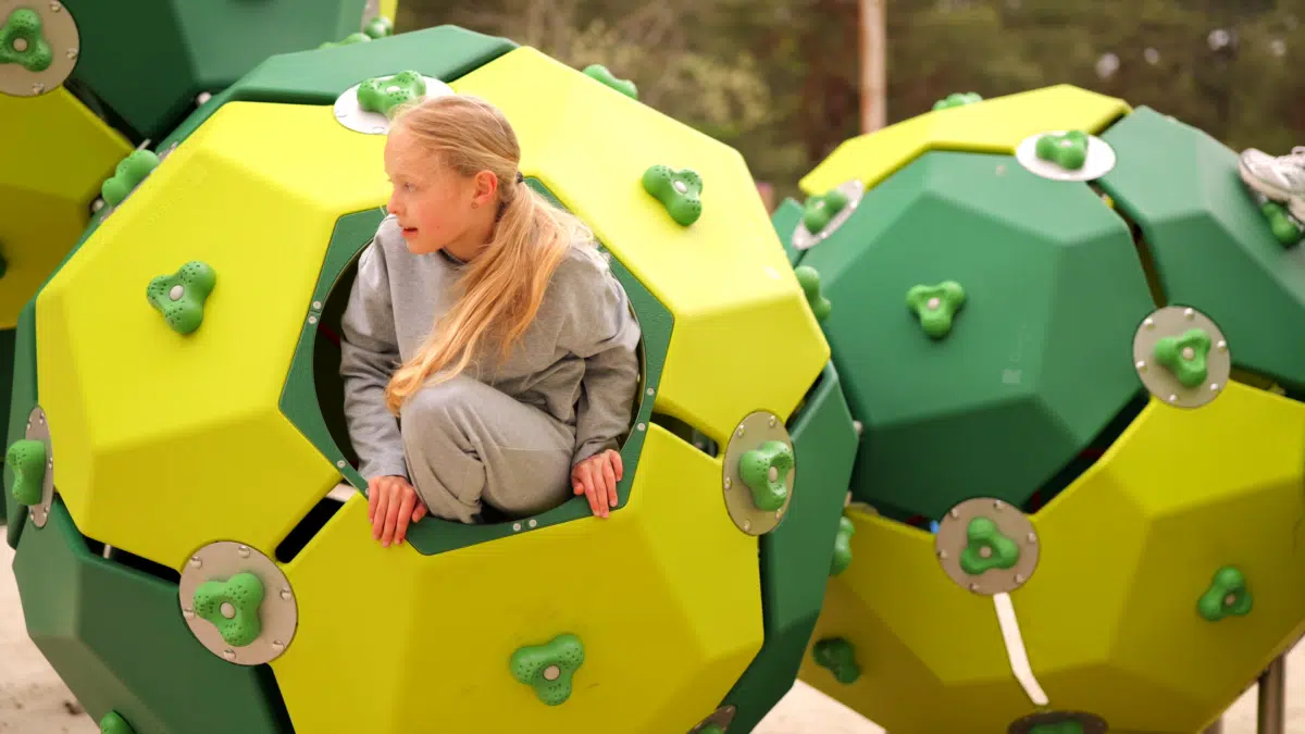 Ein junges Mädchen klettert lächelnd auf einen runden Spielplatz aus Metall und Seilen, während im Hintergrund Bäume und Grünflächen zu sehen sind.
