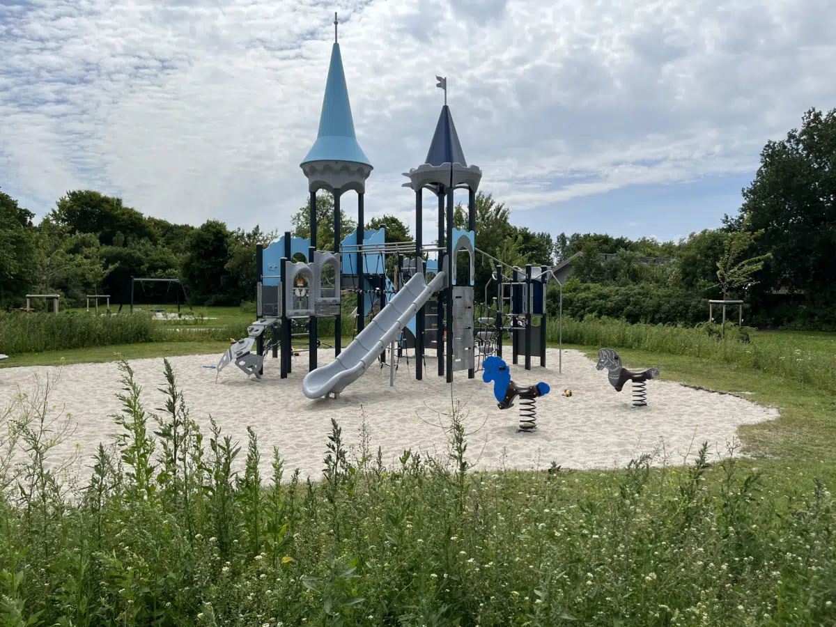 Ein hölzernes Spielplatzgebäude in Form eines Schiffes mit einem hohen Mast, Rutschen und Sand darunter. Im Hintergrund sind Bäume und ein klarer blauer Himmel zu sehen.