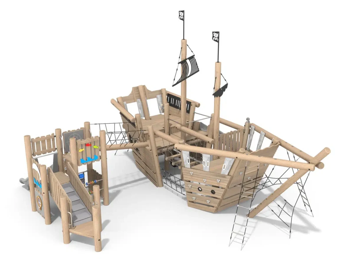 Ein hölzernes Spielplatzgebäude in Form eines Schiffes mit einem hohen Mast, Rutschen und Sand darunter. Im Hintergrund sind Bäume und ein klarer blauer Himmel zu sehen.
