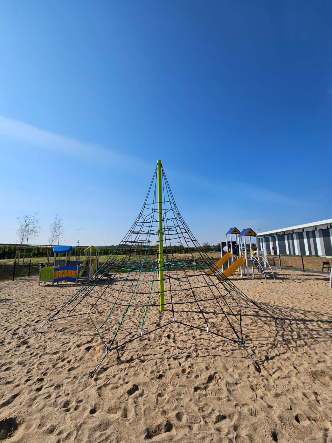 Ein junges Mädchen klettert lächelnd auf einen runden Spielplatz aus Metall und Seilen, während im Hintergrund Bäume und Grünflächen zu sehen sind.