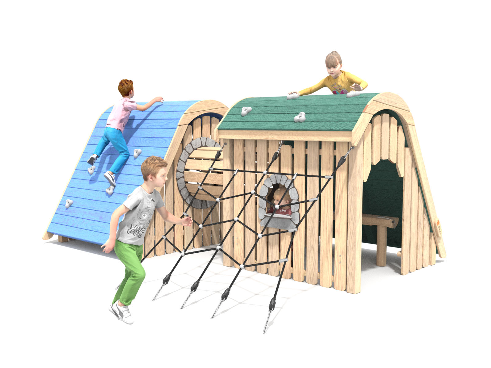 Es werden ausschließlich Materialien verwendet, die die wichtigsten Kriterien eines Spielplatzbetreibers erfüllen. Dazu zählen neben Langlebigkeit, Wartungsarmut, Widerstandsfähigkeit und Witterungsbeständigkeit auch der vielfältige Spielwert.