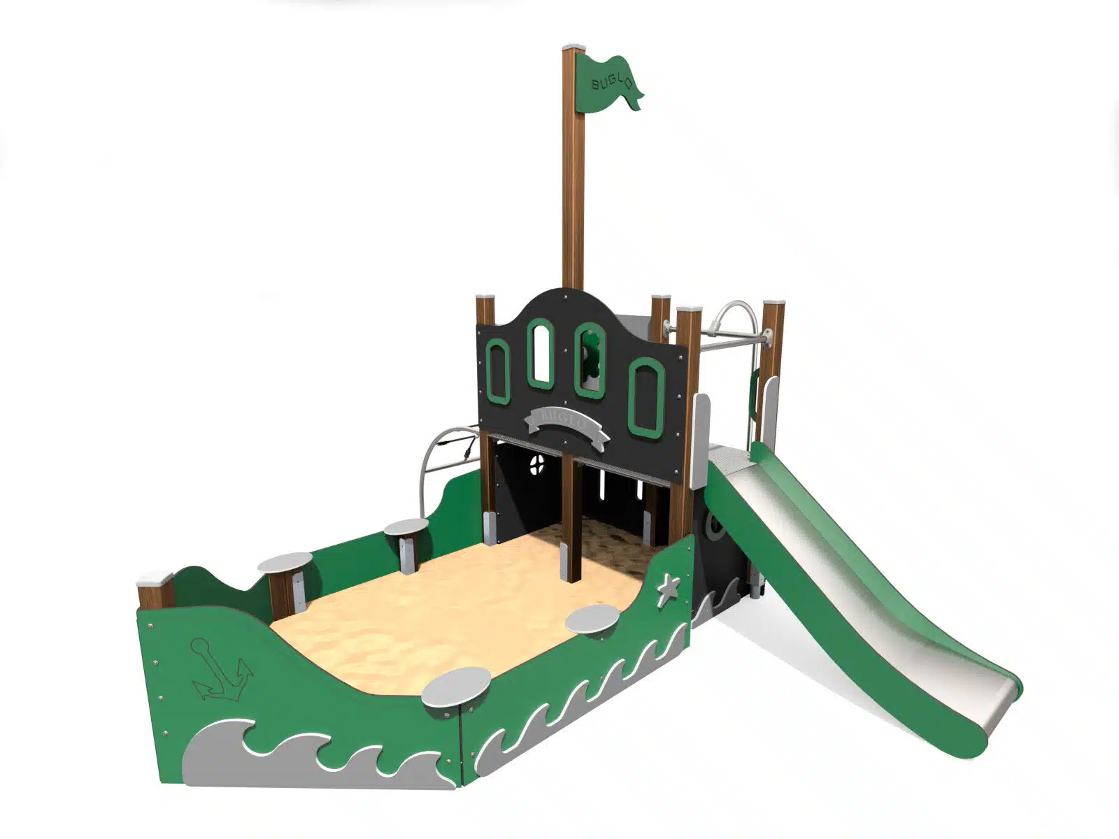 Ein hölzernes Spielplatzgebäude in Form eines Schiffes mit einem hohen Mast, Rutschen und Sand darunter. Im Hintergrund sind Bäume und ein klarer blauer Himmel zu sehen.