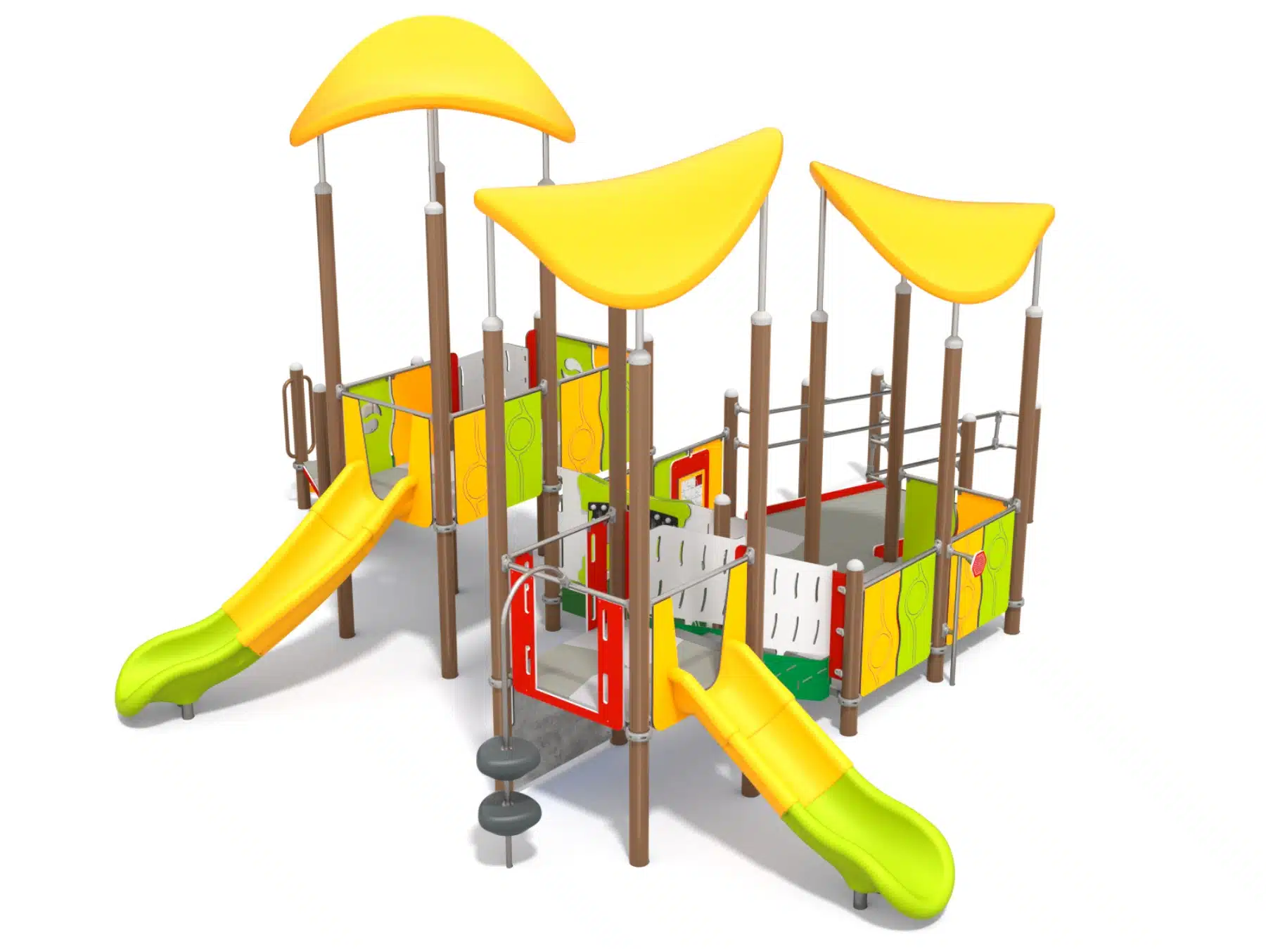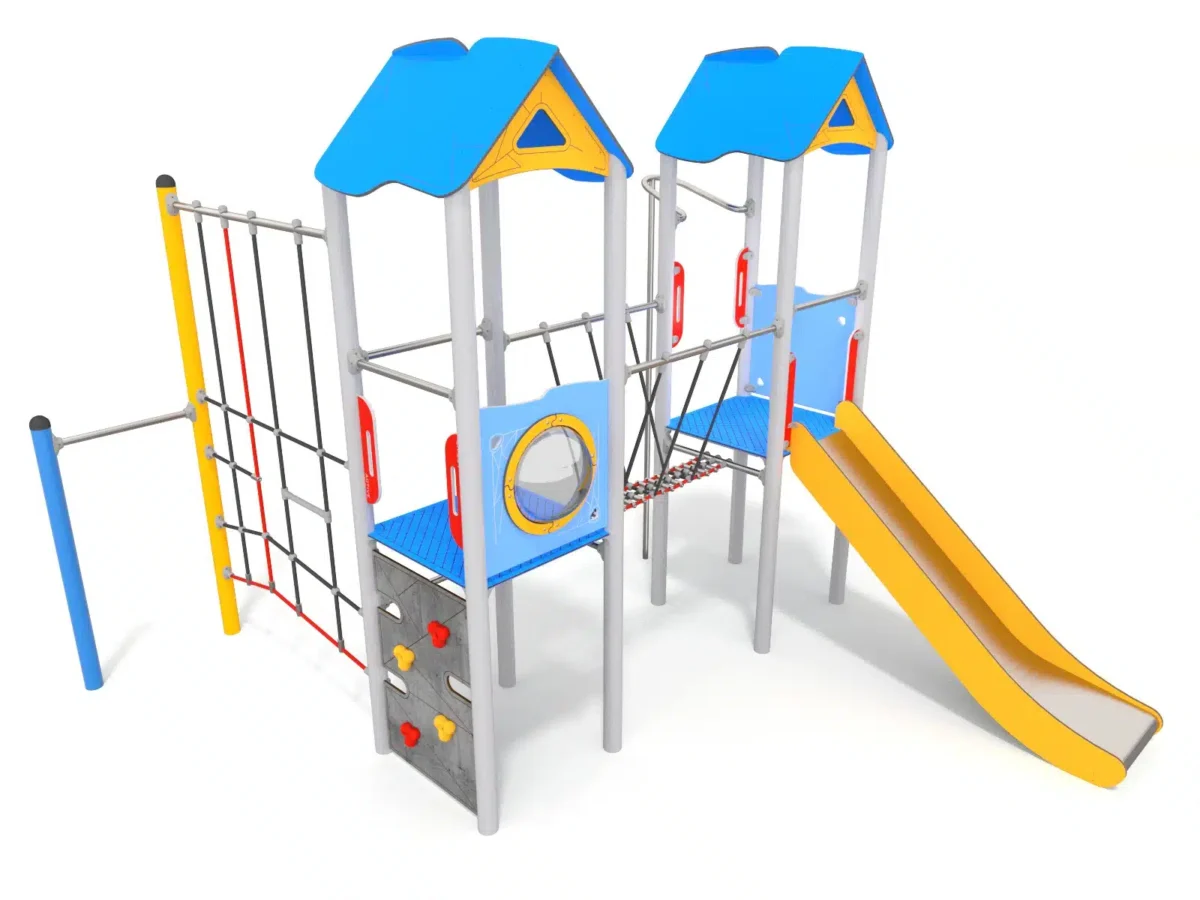 Viele Übergänge und Module sorgen für Abwechslung und lange Verweildauer. Verzinkter, pulverbeschichteter Stahl sorgt für hohe Stabilität, Schlagfestigkeit und dauerhaften Wetterschutz. Durchdachte Spielwege fördern Motorik, Koordination und Körpergefühl. Barrierearme Gestaltung fördert gemeinsames Spielen und ermöglicht vielfältige Nutzung für alle Kinder. Geeignet für den angegebenen Altersbereich 3 – 12. Setzt einen starken Akzent und wertet jede Spielfläche sichtbar auf.