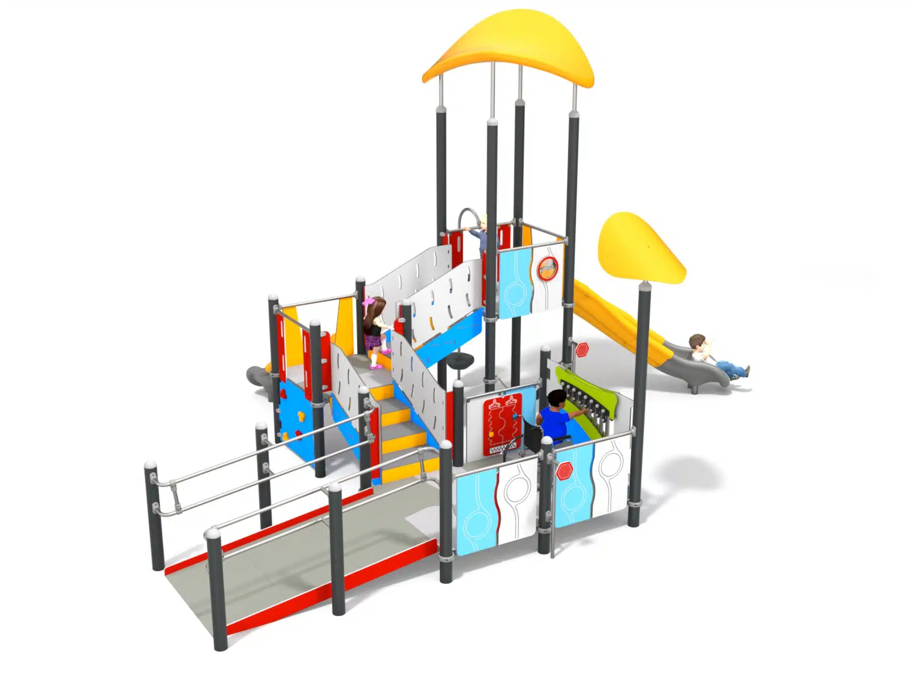 Kombinierte Spielwege schaffen fließende Bewegung und gemeinsames Erleben. Verzinkter, pulverbeschichteter Stahl sorgt für hohe Stabilität, Schlagfestigkeit und dauerhaften Wetterschutz. Mehrere gleichzeitige Nutzungsmöglichkeiten reduzieren Wartezeiten und erhöhen den Spielwert. Barrierearme Gestaltung fördert gemeinsames Spielen und ermöglicht vielfältige Nutzung für alle Kinder. Geeignet für den angegebenen Altersbereich 3 – 12. Setzt einen starken Akzent und wertet jede Spielfläche sichtbar auf.