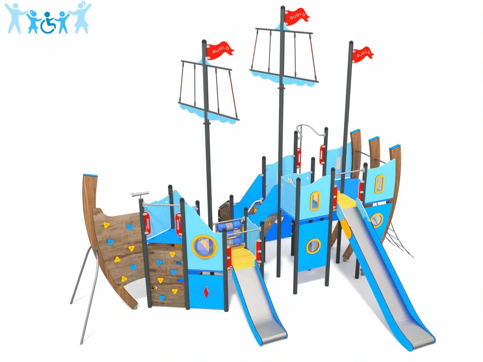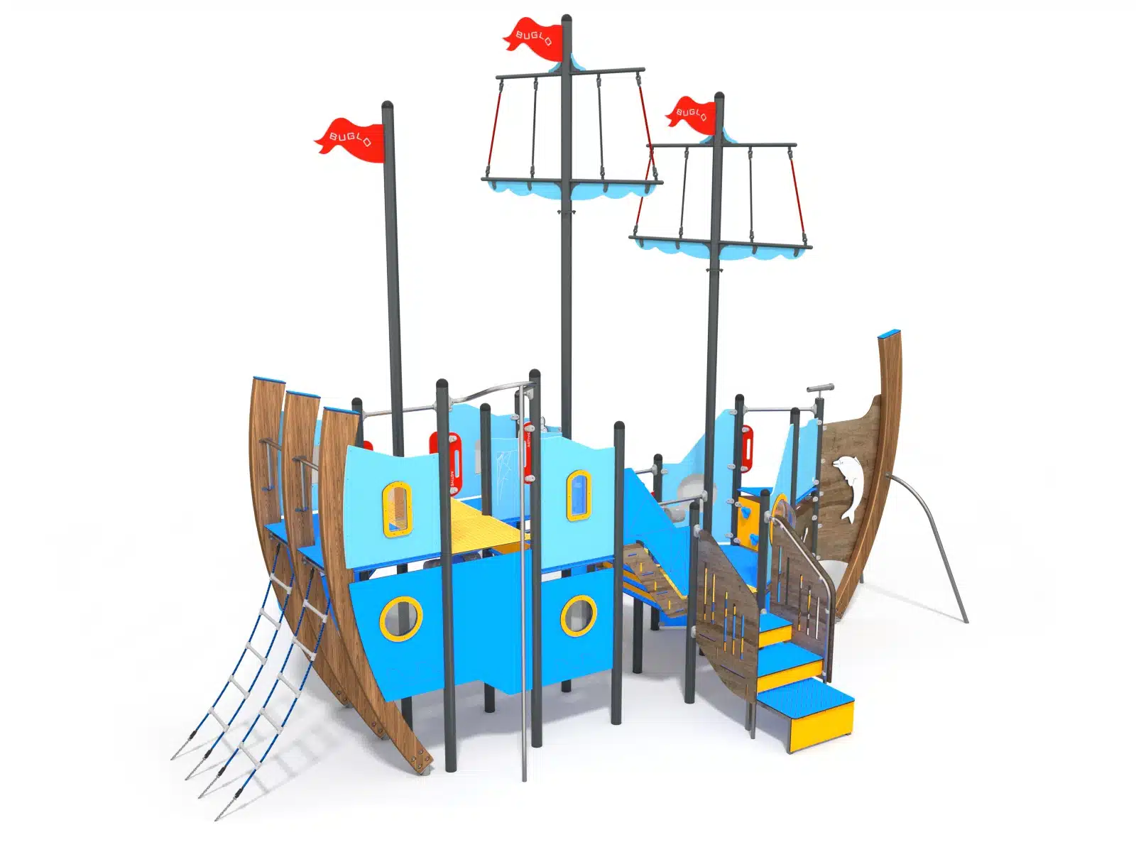 Ein hölzernes Spielplatzgebäude in Form eines Schiffes mit einem hohen Mast, Rutschen und Sand darunter. Im Hintergrund sind Bäume und ein klarer blauer Himmel zu sehen.
