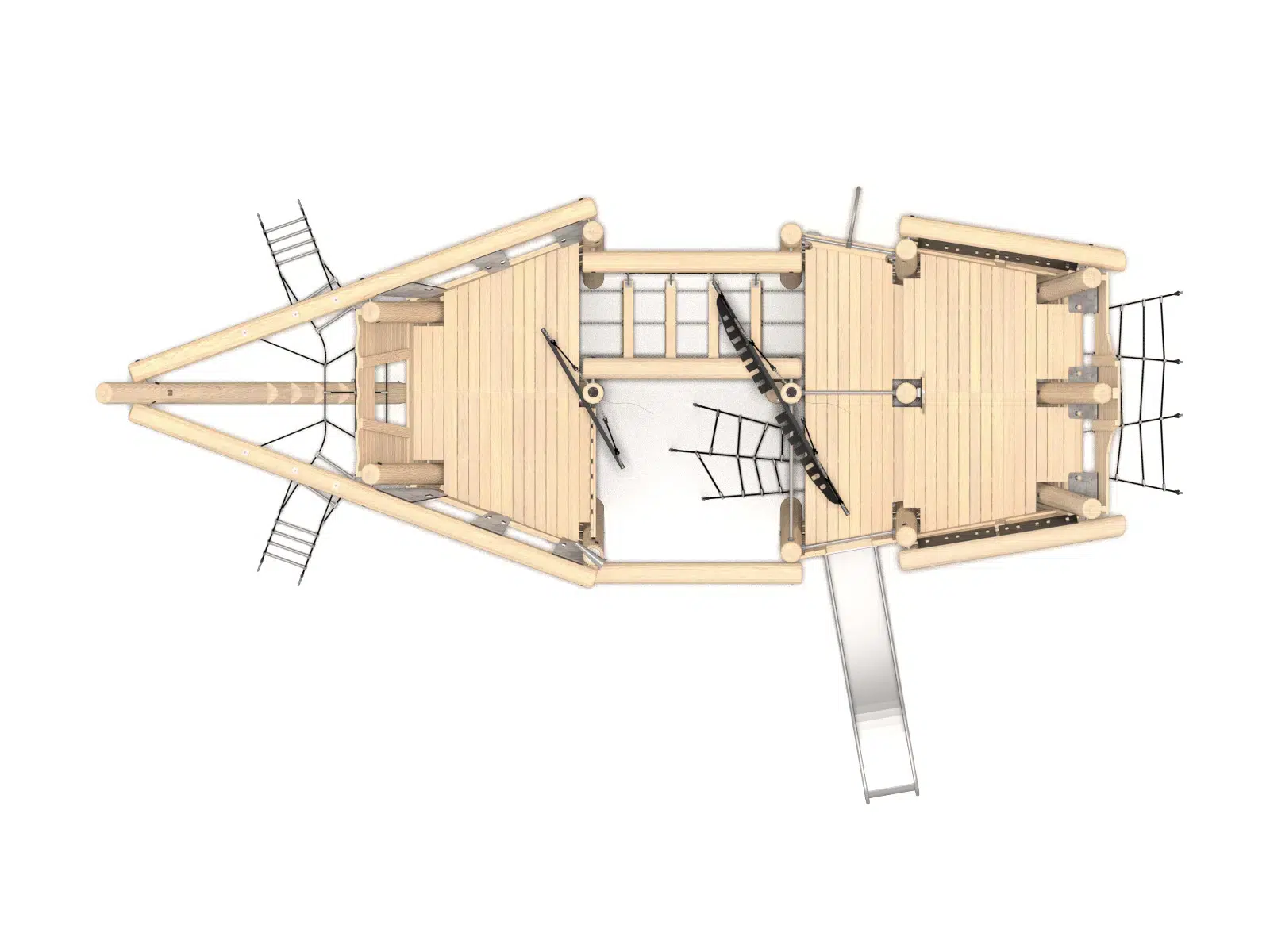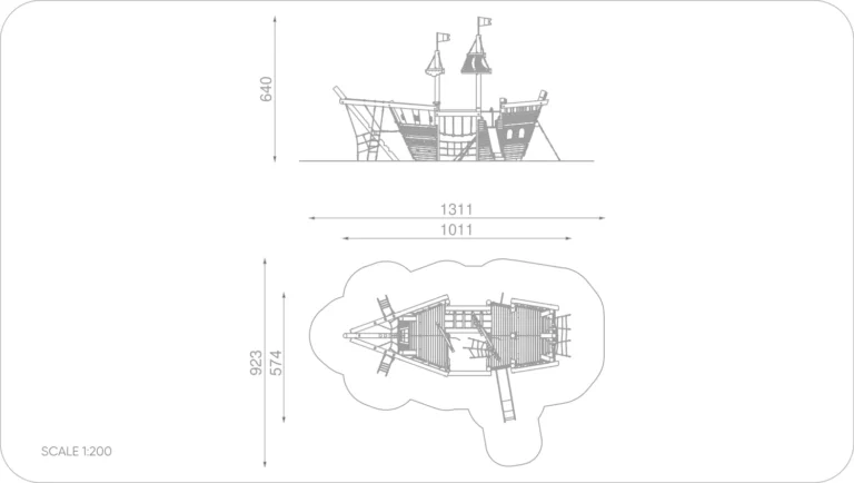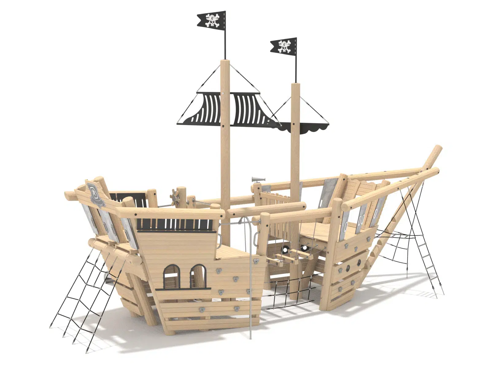Ein hölzernes Spielplatzgebäude in Form eines Schiffes mit einem hohen Mast, Rutschen und Sand darunter. Im Hintergrund sind Bäume und ein klarer blauer Himmel zu sehen.