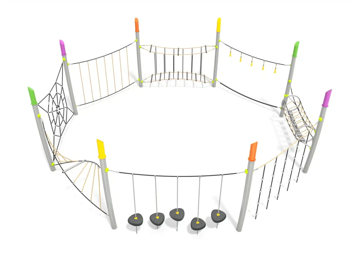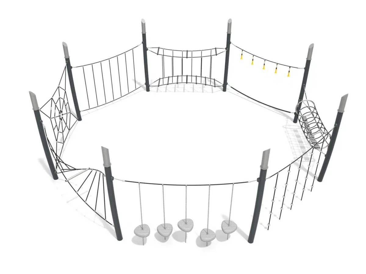 Ein junges Mädchen klettert lächelnd auf einen runden Spielplatz aus Metall und Seilen, während im Hintergrund Bäume und Grünflächen zu sehen sind.