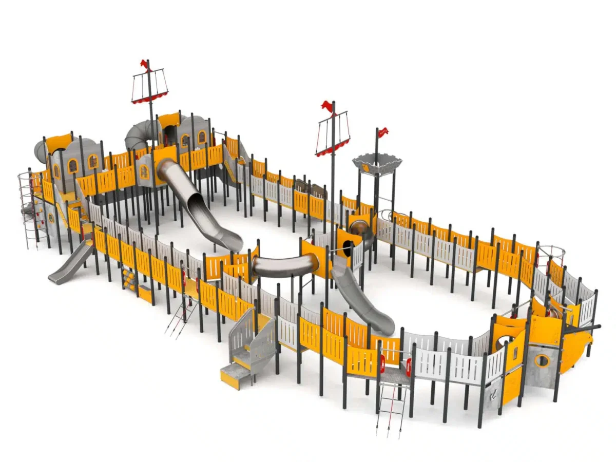 Ein hölzernes Spielplatzgebäude in Form eines Schiffes mit einem hohen Mast, Rutschen und Sand darunter. Im Hintergrund sind Bäume und ein klarer blauer Himmel zu sehen.