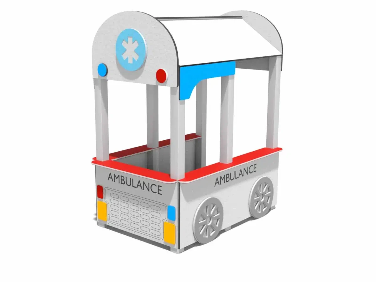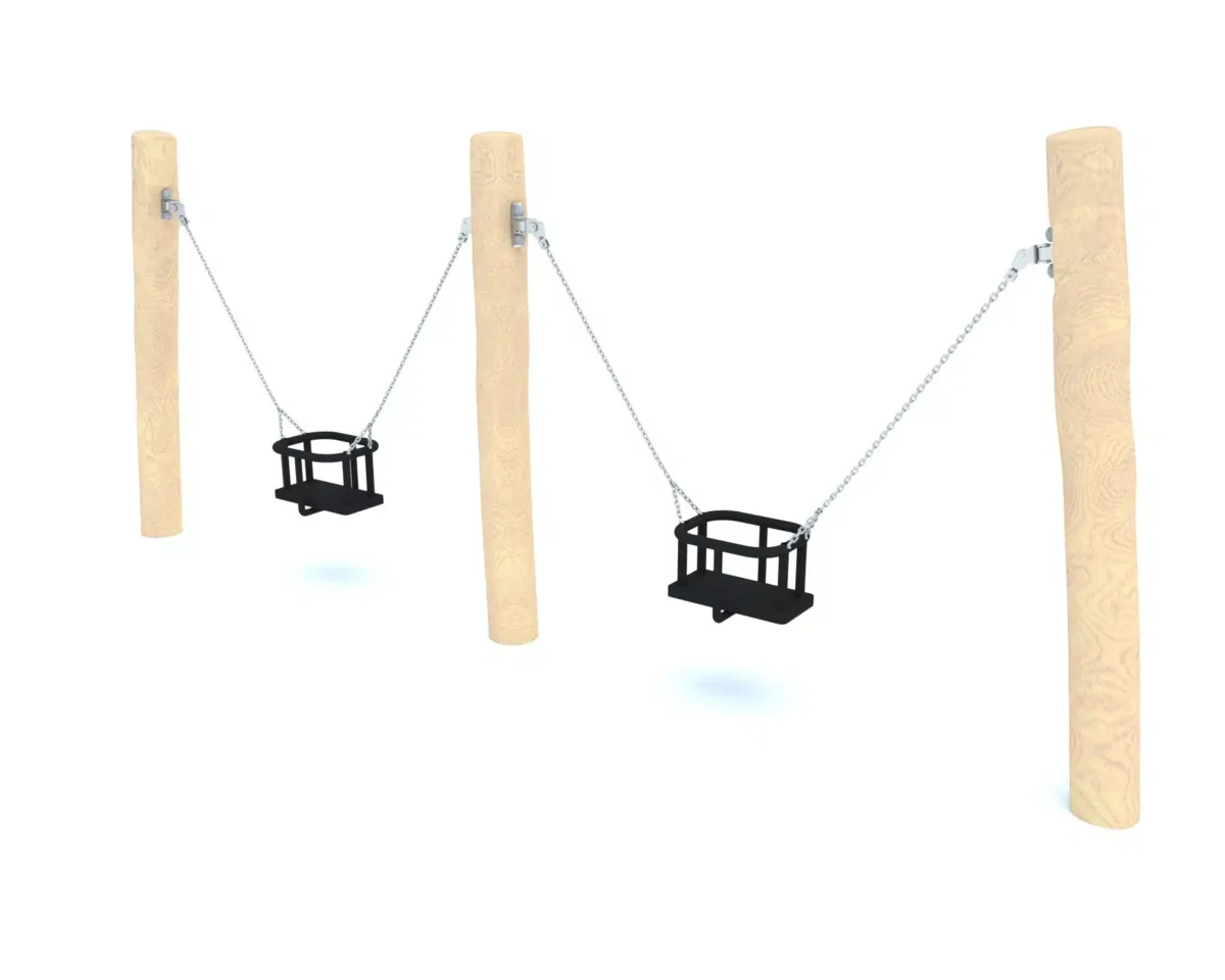 Ein hölzernes Spielplatzgebäude in Form eines Schiffes mit einem hohen Mast, Rutschen und Sand darunter. Im Hintergrund sind Bäume und ein klarer blauer Himmel zu sehen.