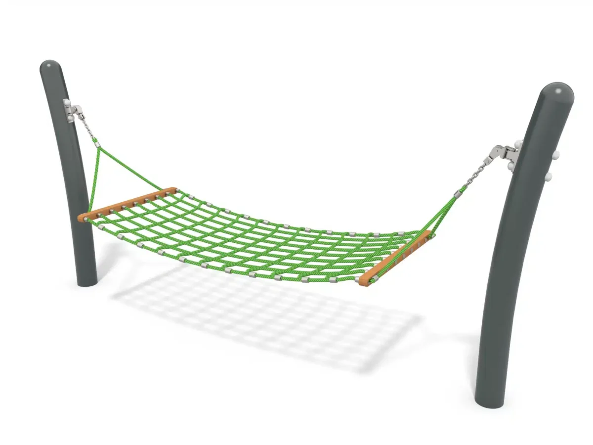Ein junges Mädchen klettert lächelnd auf einen runden Spielplatz aus Metall und Seilen, während im Hintergrund Bäume und Grünflächen zu sehen sind.