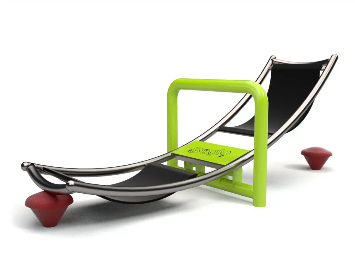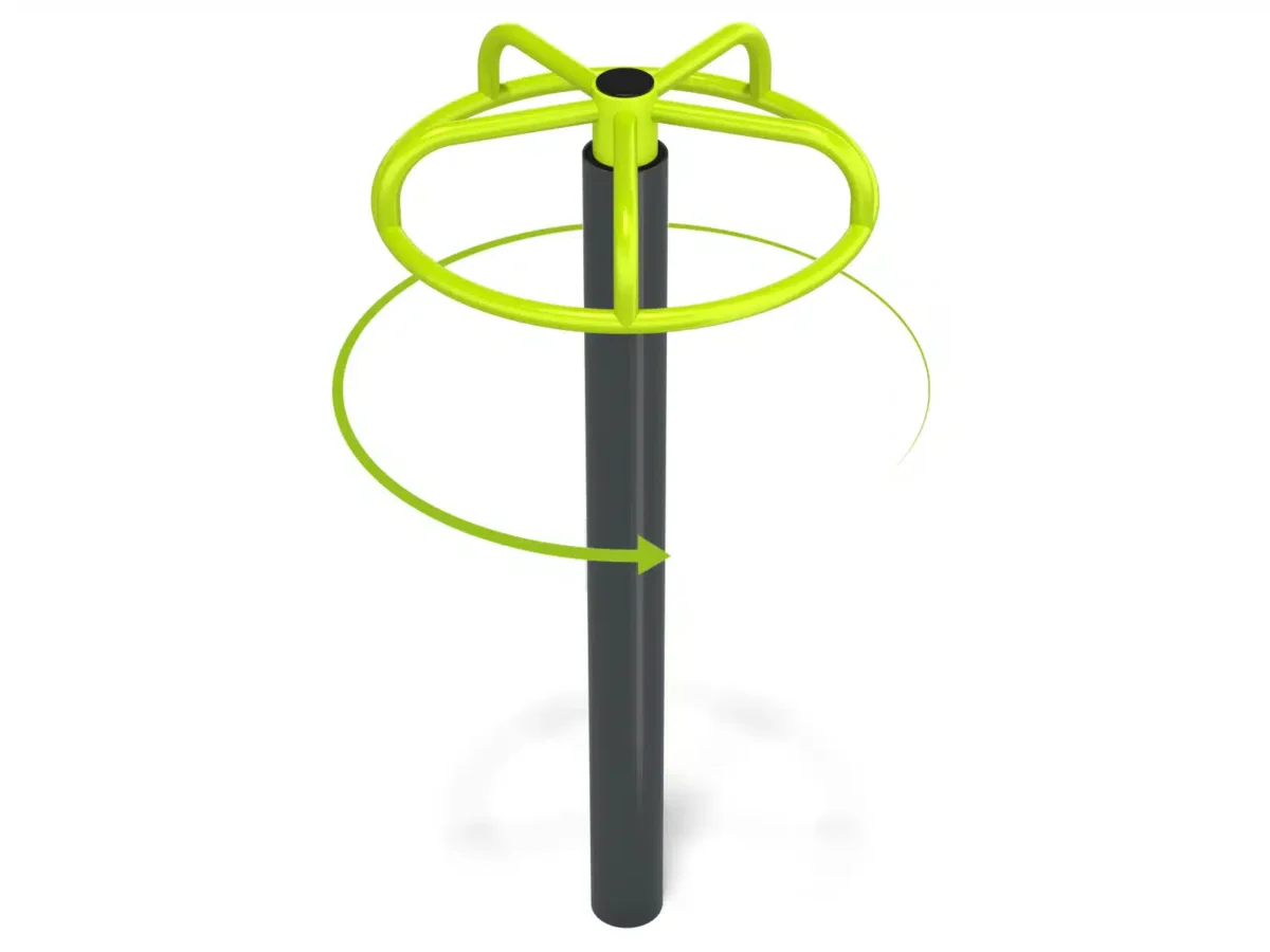 Ein junges Mädchen klettert lächelnd auf einen runden Spielplatz aus Metall und Seilen, während im Hintergrund Bäume und Grünflächen zu sehen sind.