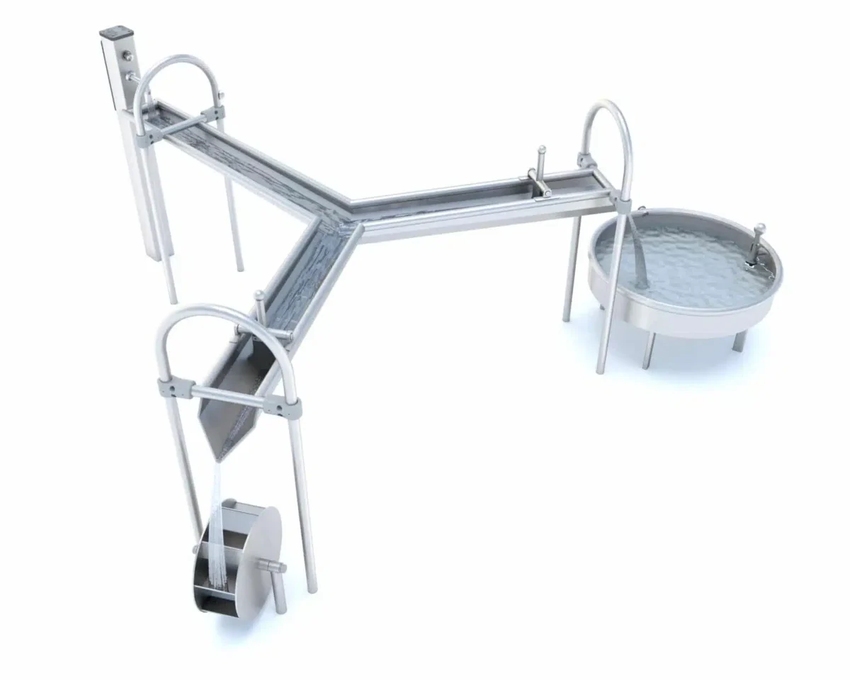 Ein hölzernes Spielplatzgebäude in Form eines Schiffes mit einem hohen Mast, Rutschen und Sand darunter. Im Hintergrund sind Bäume und ein klarer blauer Himmel zu sehen.