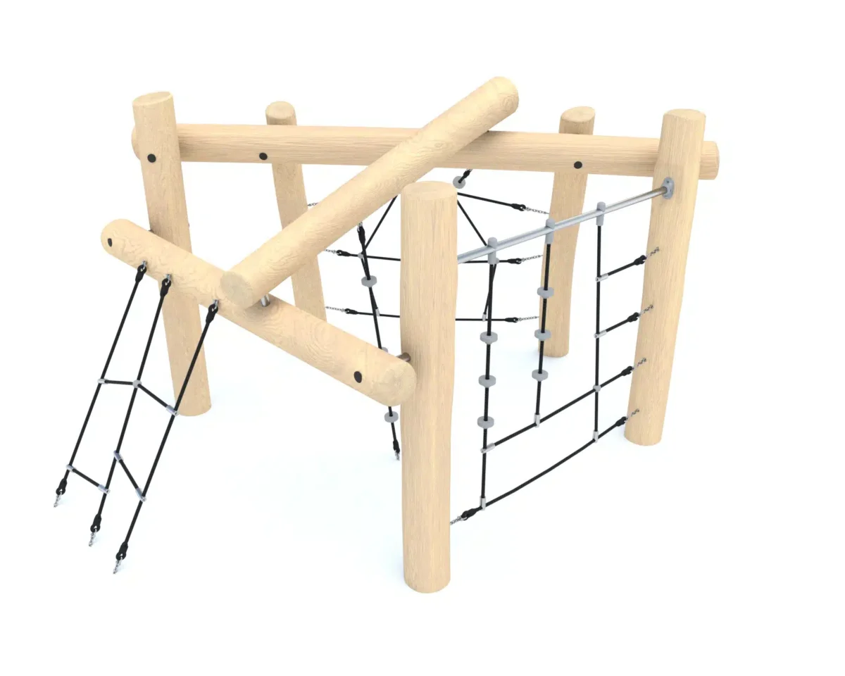 Ein junges Mädchen klettert lächelnd auf einen runden Spielplatz aus Metall und Seilen, während im Hintergrund Bäume und Grünflächen zu sehen sind.
