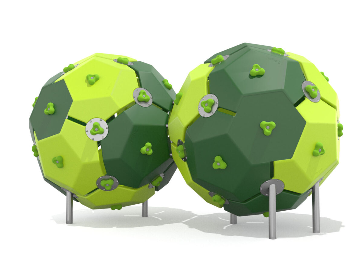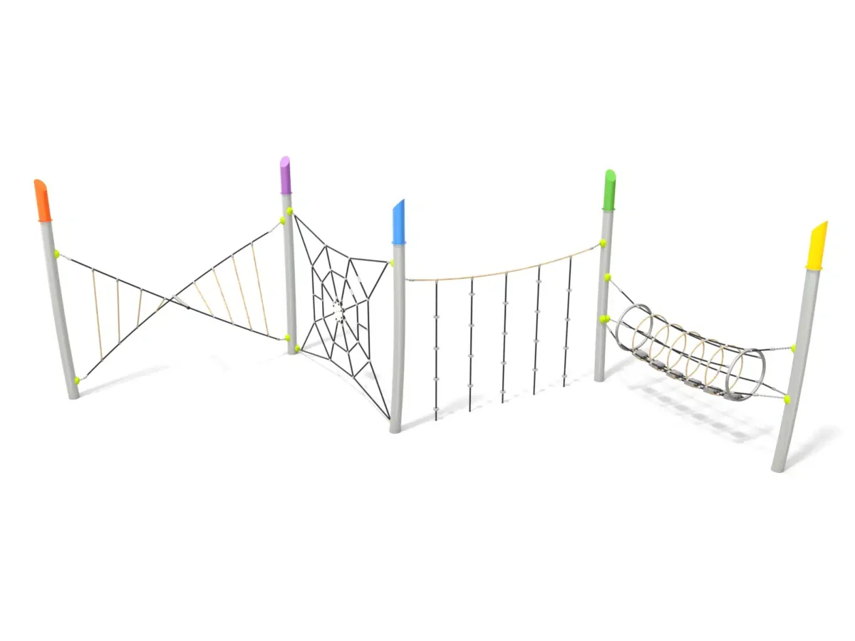 Ein junges Mädchen klettert lächelnd auf einen runden Spielplatz aus Metall und Seilen, während im Hintergrund Bäume und Grünflächen zu sehen sind.