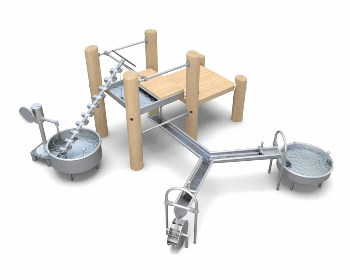 Ein hölzernes Spielplatzgebäude in Form eines Schiffes mit einem hohen Mast, Rutschen und Sand darunter. Im Hintergrund sind Bäume und ein klarer blauer Himmel zu sehen.