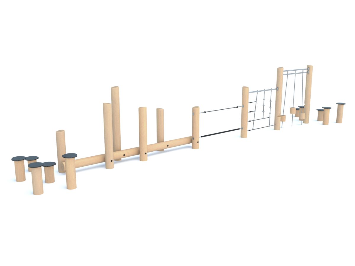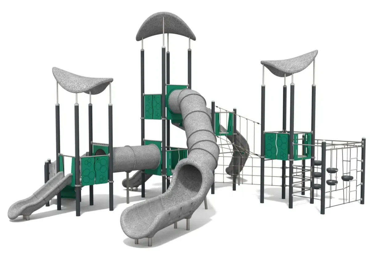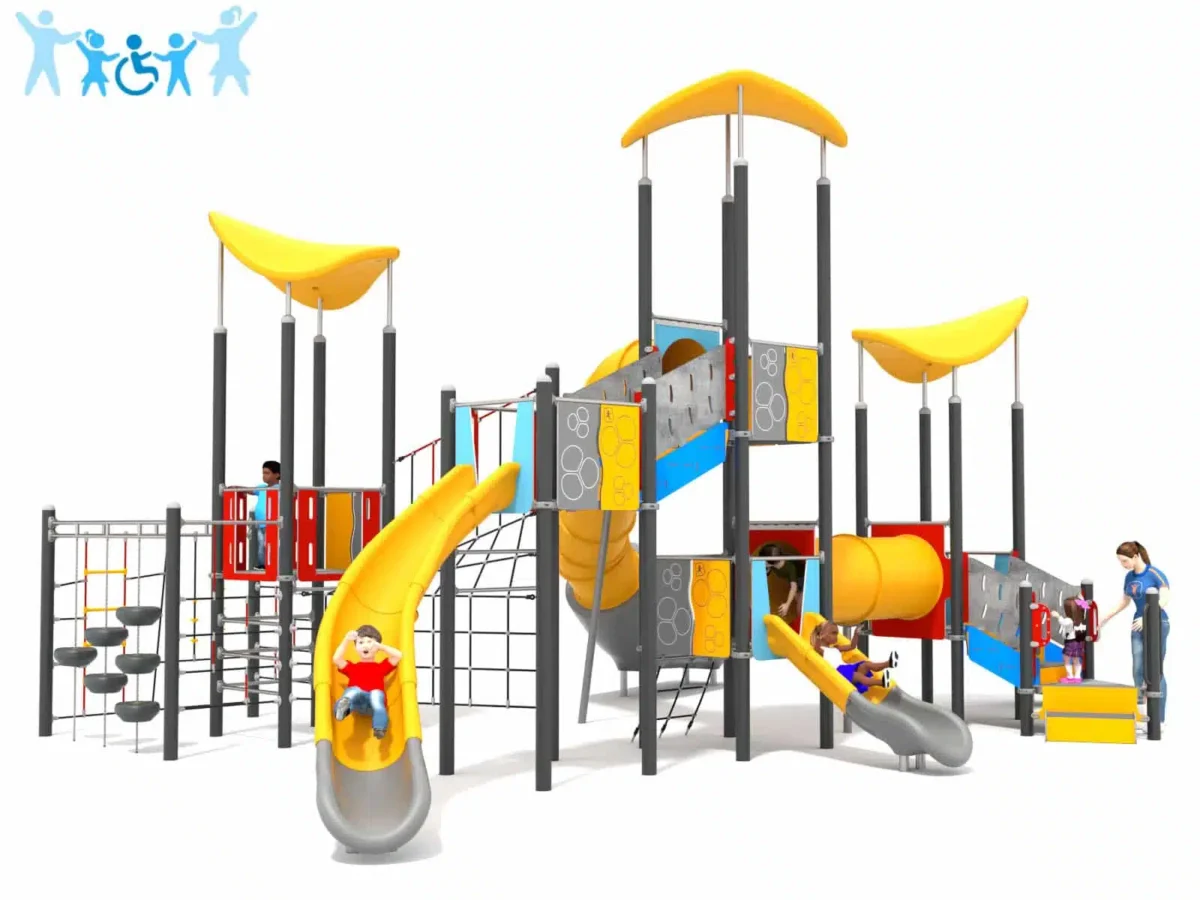 Ein junges Mädchen klettert lächelnd auf einen runden Spielplatz aus Metall und Seilen, während im Hintergrund Bäume und Grünflächen zu sehen sind.