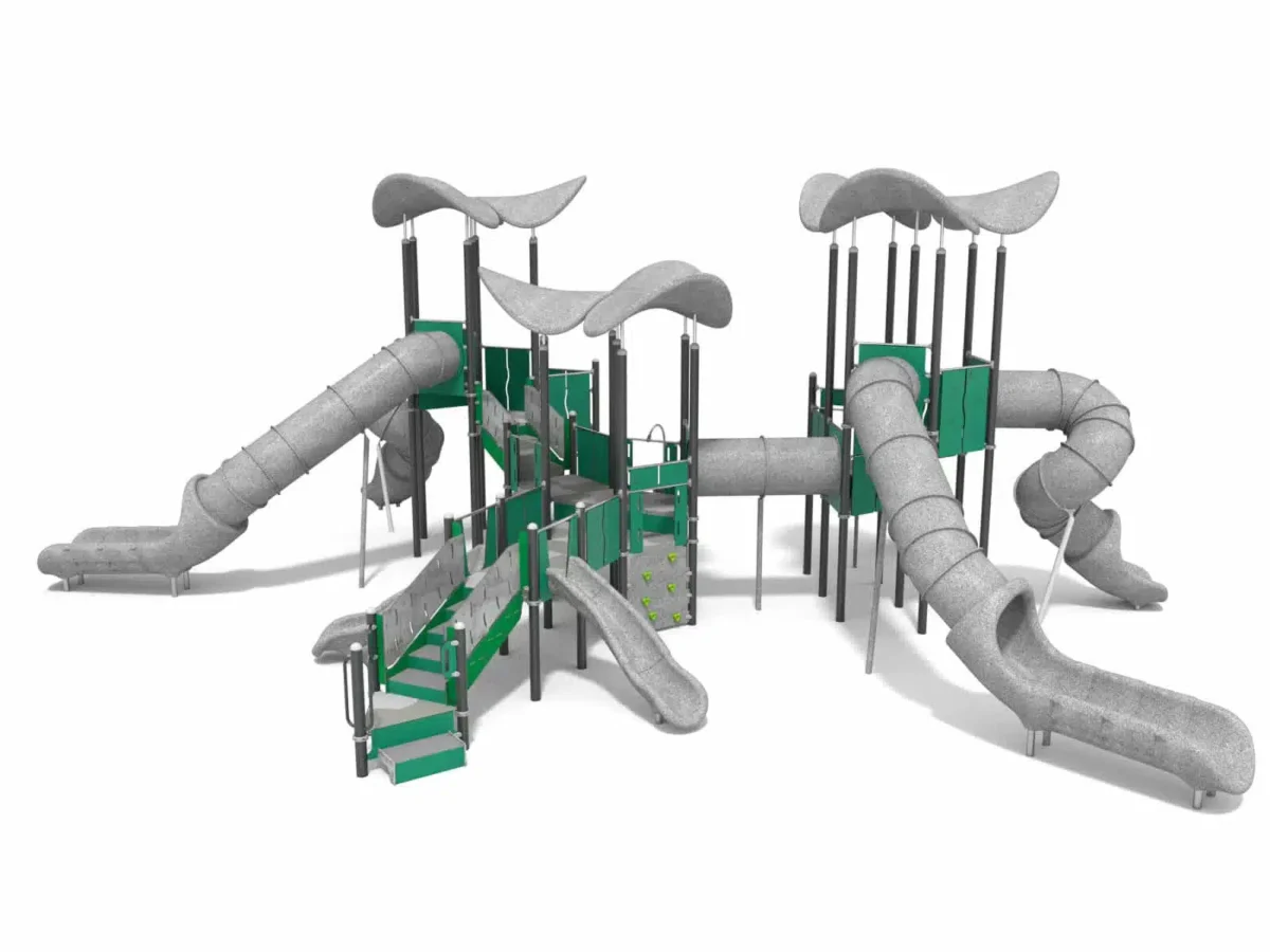 Ein junges Mädchen klettert lächelnd auf einen runden Spielplatz aus Metall und Seilen, während im Hintergrund Bäume und Grünflächen zu sehen sind.