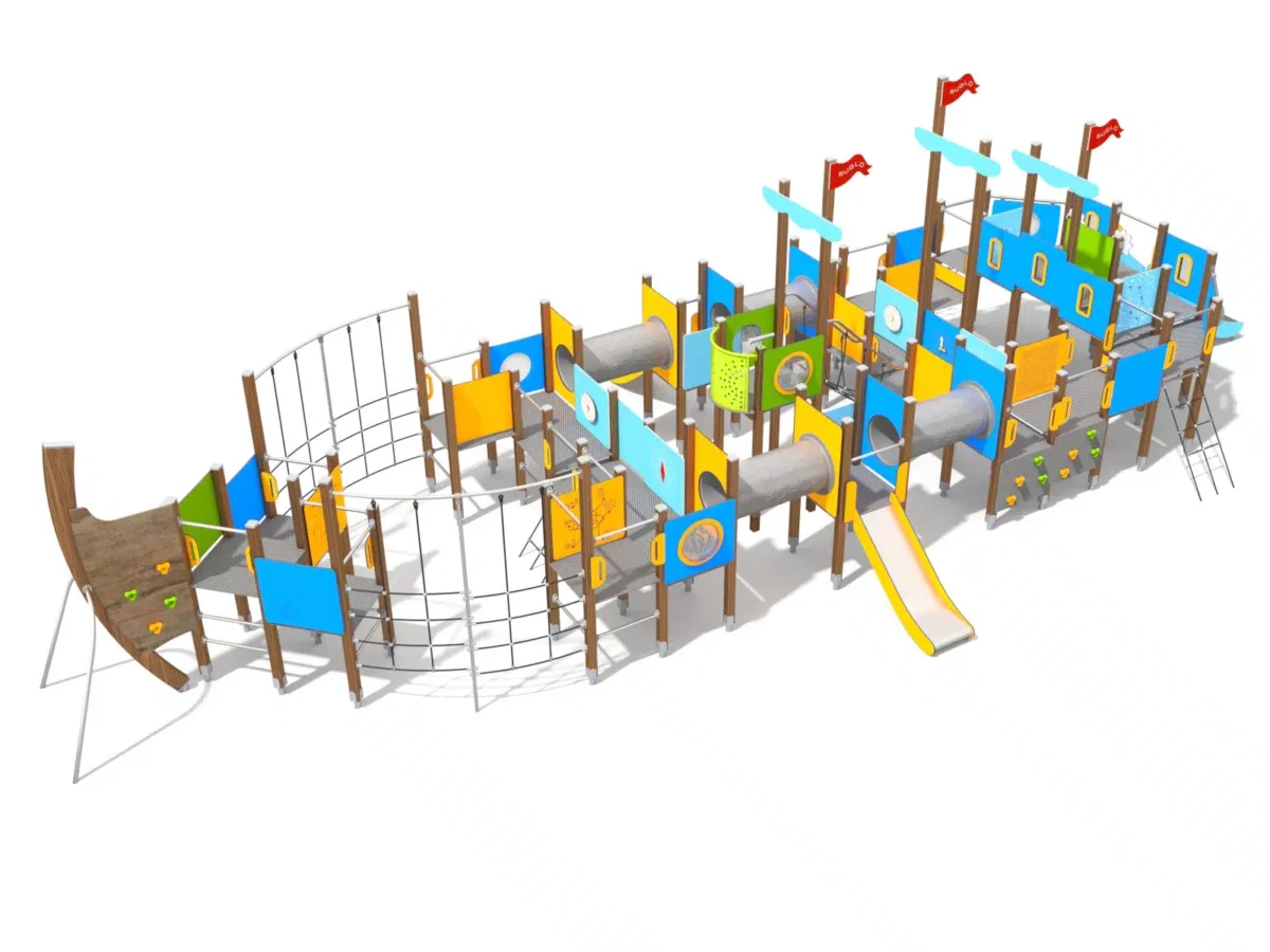 Ein hölzernes Spielplatzgebäude in Form eines Schiffes mit einem hohen Mast, Rutschen und Sand darunter. Im Hintergrund sind Bäume und ein klarer blauer Himmel zu sehen.
