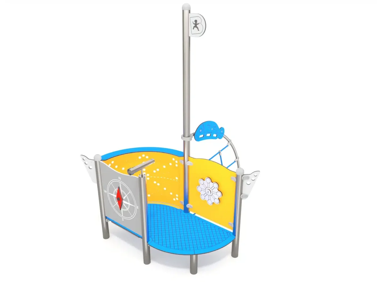 Ein hölzernes Spielplatzgebäude in Form eines Schiffes mit einem hohen Mast, Rutschen und Sand darunter. Im Hintergrund sind Bäume und ein klarer blauer Himmel zu sehen.