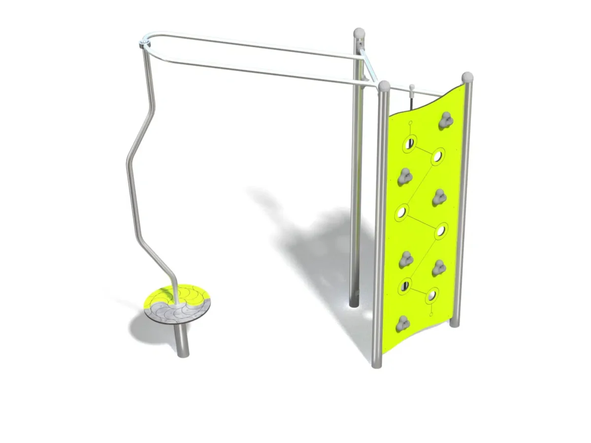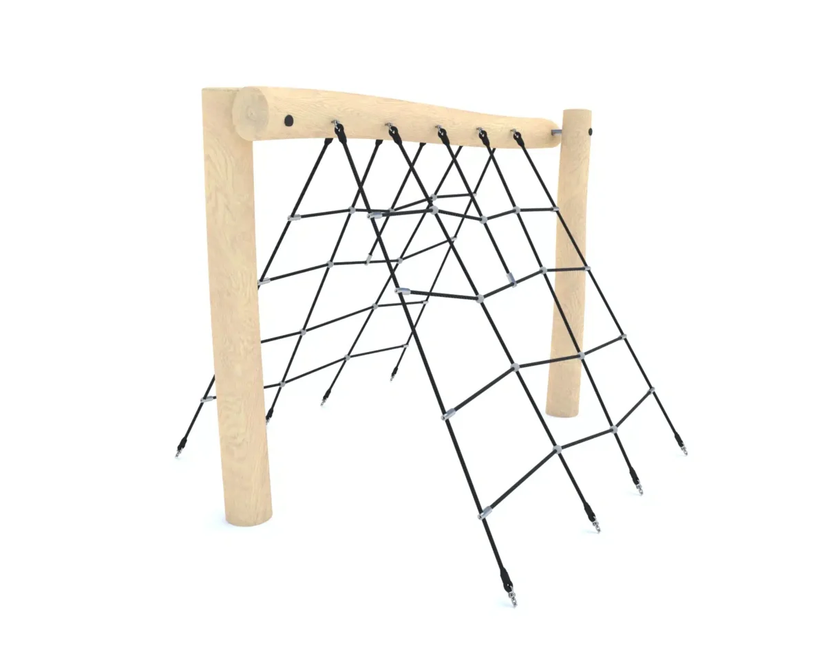Ein junges Mädchen klettert lächelnd auf einen runden Spielplatz aus Metall und Seilen, während im Hintergrund Bäume und Grünflächen zu sehen sind.