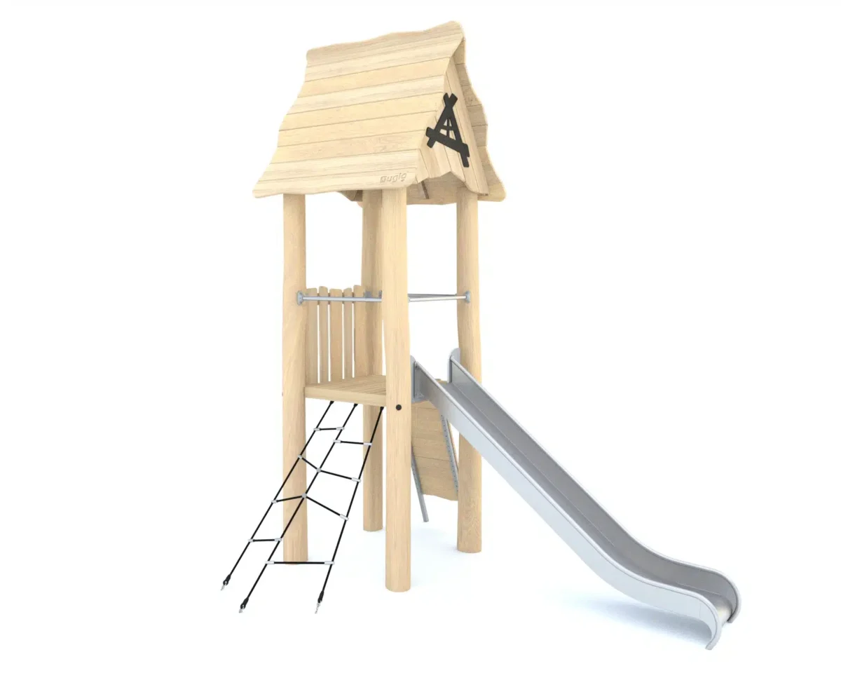 Ein hölzernes Spielplatzgebäude in Form eines Schiffes mit einem hohen Mast, Rutschen und Sand darunter. Im Hintergrund sind Bäume und ein klarer blauer Himmel zu sehen.