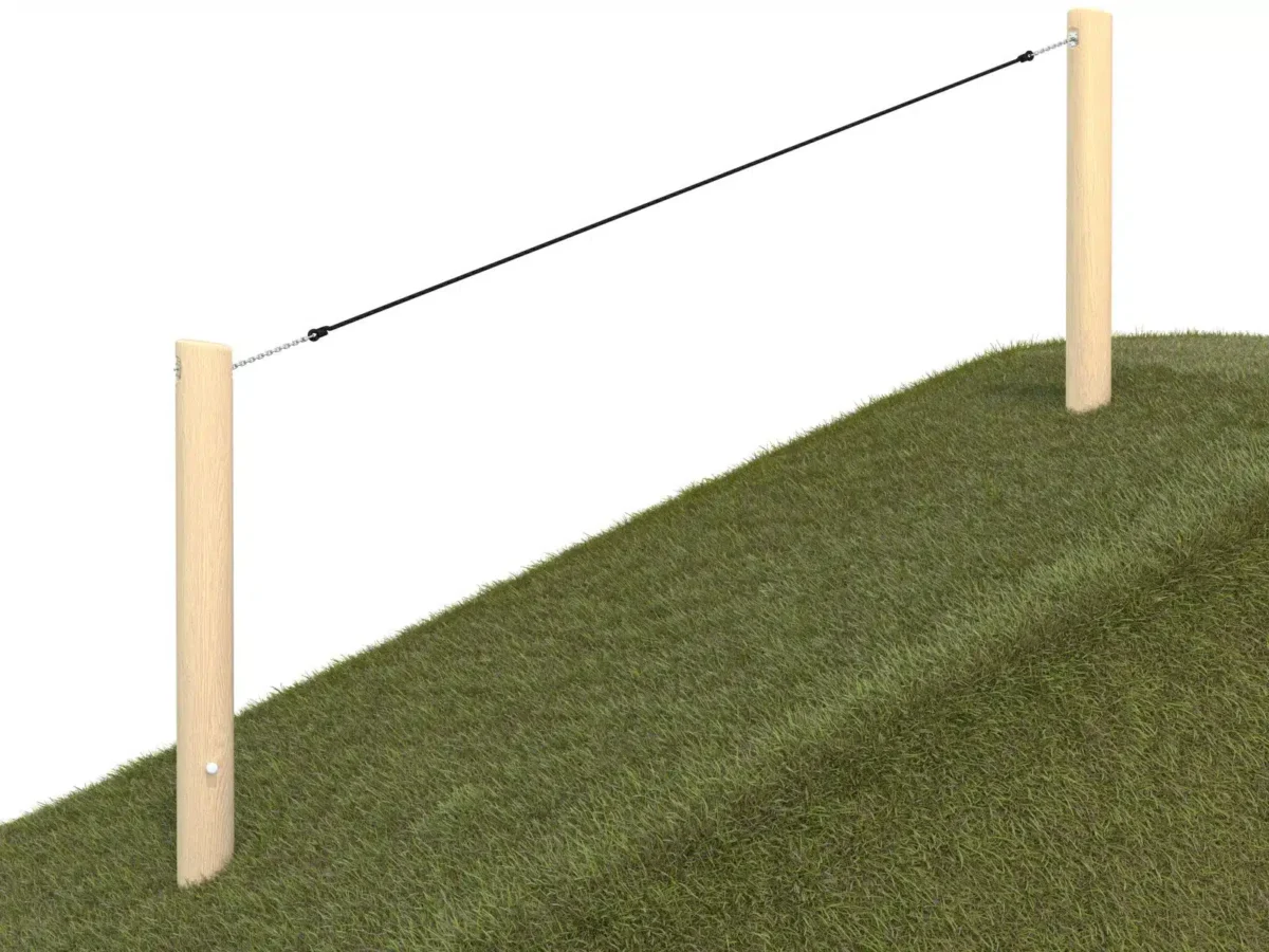 Ein junges Mädchen klettert lächelnd auf einen runden Spielplatz aus Metall und Seilen, während im Hintergrund Bäume und Grünflächen zu sehen sind.