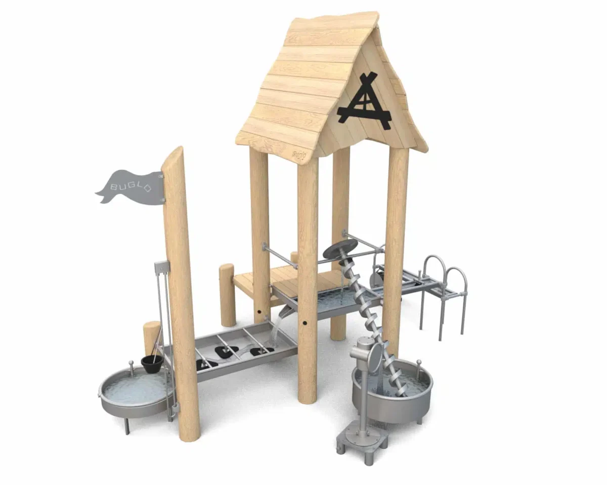 Ein hölzernes Spielplatzgebäude in Form eines Schiffes mit einem hohen Mast, Rutschen und Sand darunter. Im Hintergrund sind Bäume und ein klarer blauer Himmel zu sehen.