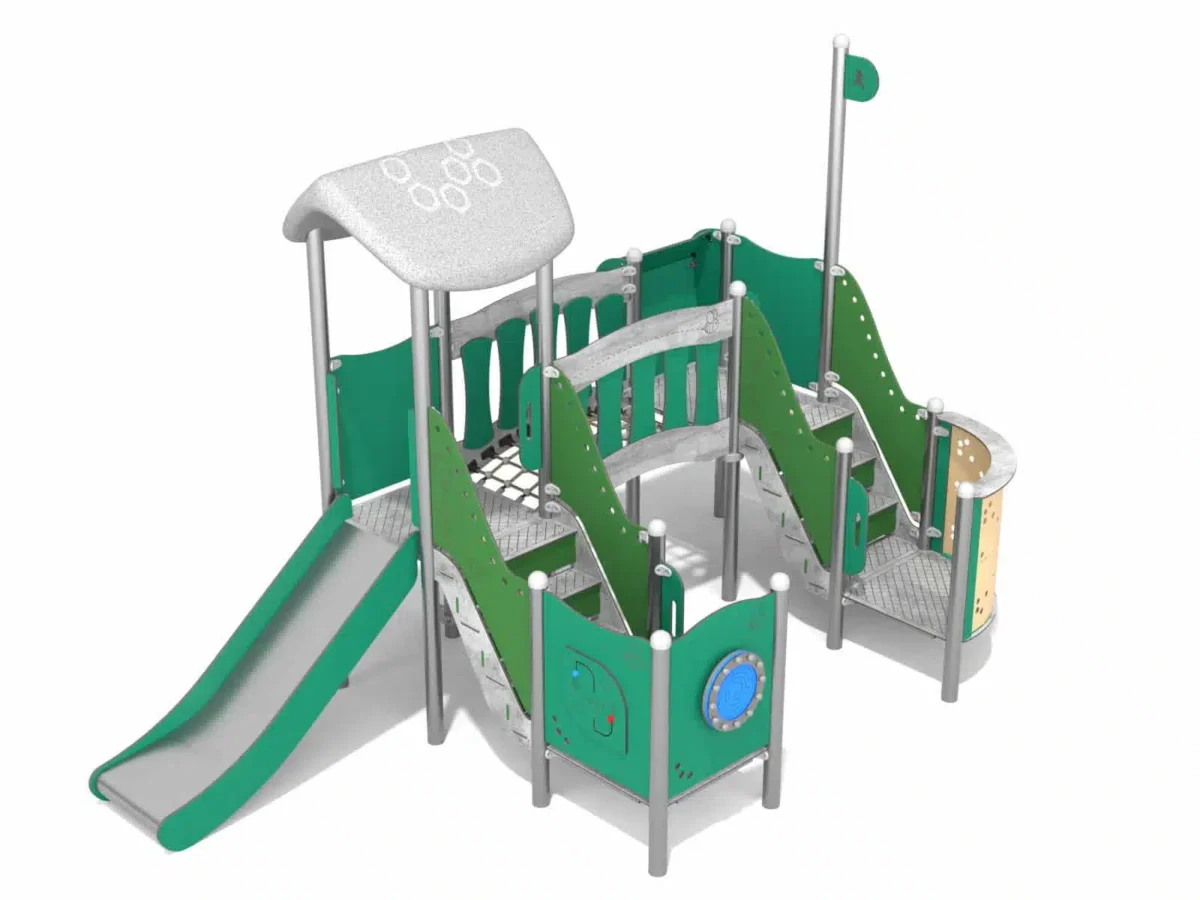 Ein hölzernes Spielplatzgebäude in Form eines Schiffes mit einem hohen Mast, Rutschen und Sand darunter. Im Hintergrund sind Bäume und ein klarer blauer Himmel zu sehen.