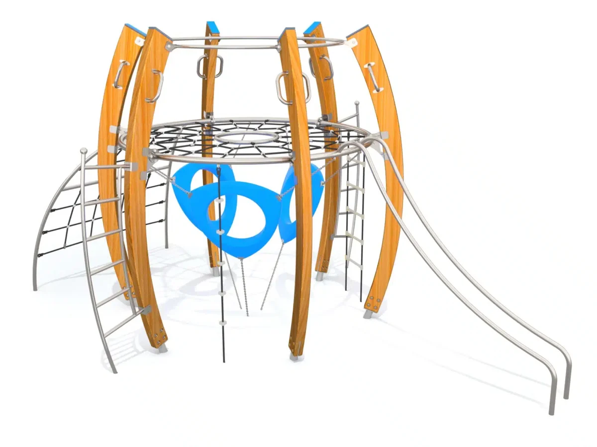 Ein junges Mädchen klettert lächelnd auf einen runden Spielplatz aus Metall und Seilen, während im Hintergrund Bäume und Grünflächen zu sehen sind.