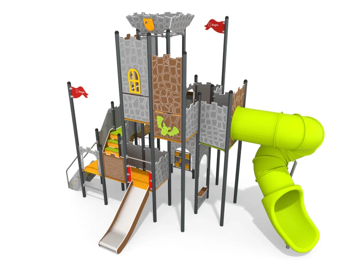 Ein junges Mädchen klettert lächelnd auf einen runden Spielplatz aus Metall und Seilen, während im Hintergrund Bäume und Grünflächen zu sehen sind.