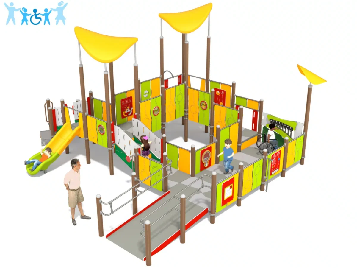 Ein hölzernes Spielplatzgebäude in Form eines Schiffes mit einem hohen Mast, Rutschen und Sand darunter. Im Hintergrund sind Bäume und ein klarer blauer Himmel zu sehen.