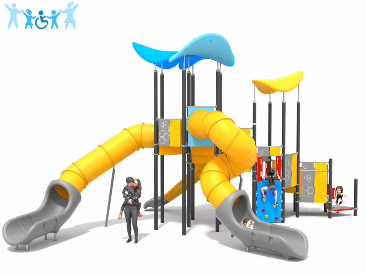 Ein junges Mädchen klettert lächelnd auf einen runden Spielplatz aus Metall und Seilen, während im Hintergrund Bäume und Grünflächen zu sehen sind.