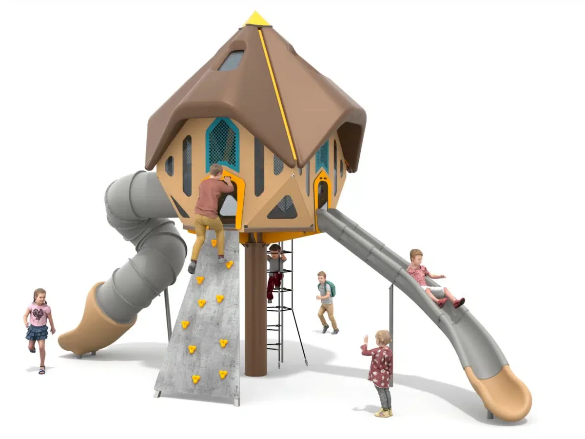 Ein hölzernes Spielplatzgebäude in Form eines Schiffes mit einem hohen Mast, Rutschen und Sand darunter. Im Hintergrund sind Bäume und ein klarer blauer Himmel zu sehen.