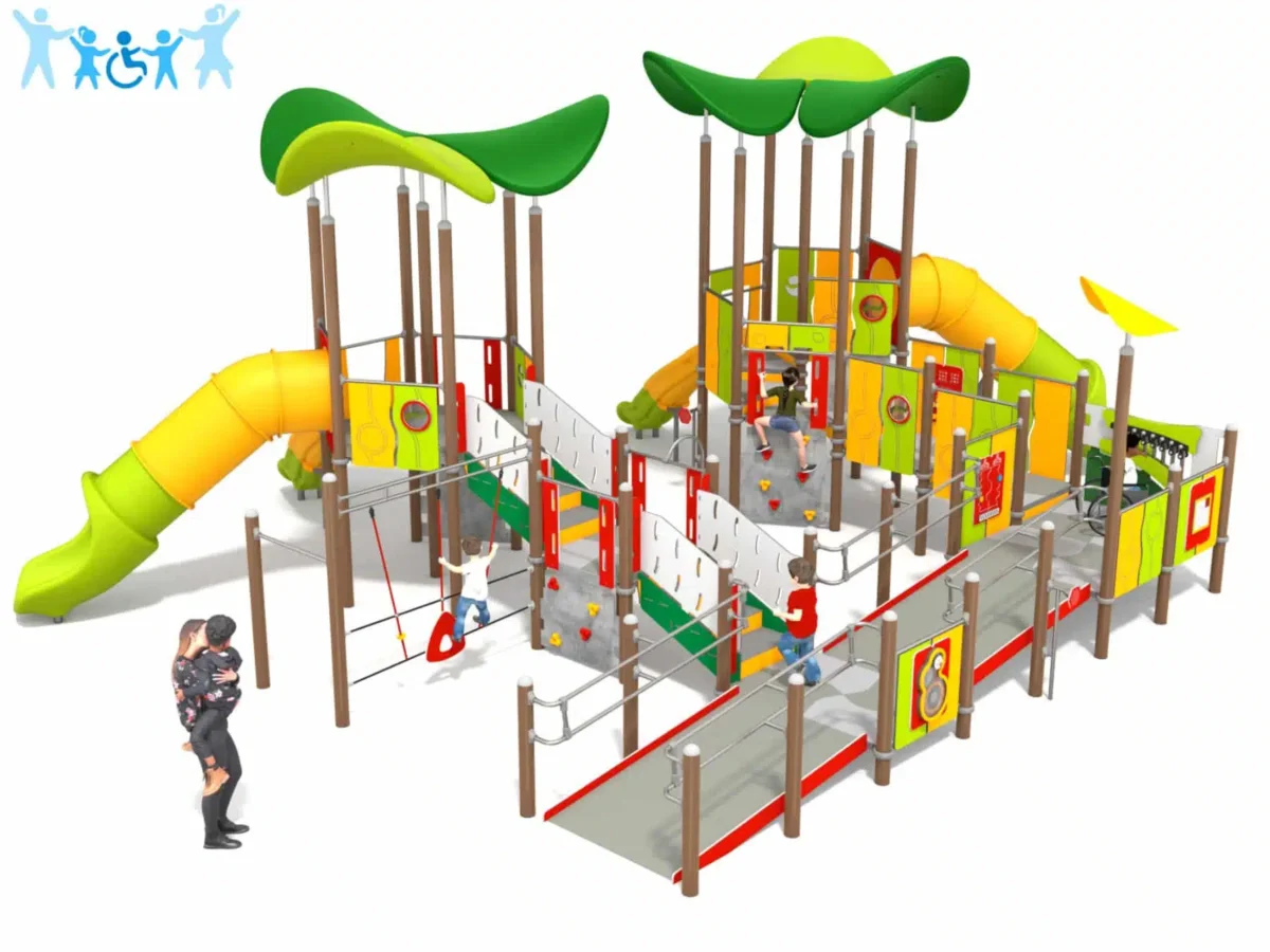 Ein junges Mädchen klettert lächelnd auf einen runden Spielplatz aus Metall und Seilen, während im Hintergrund Bäume und Grünflächen zu sehen sind.
