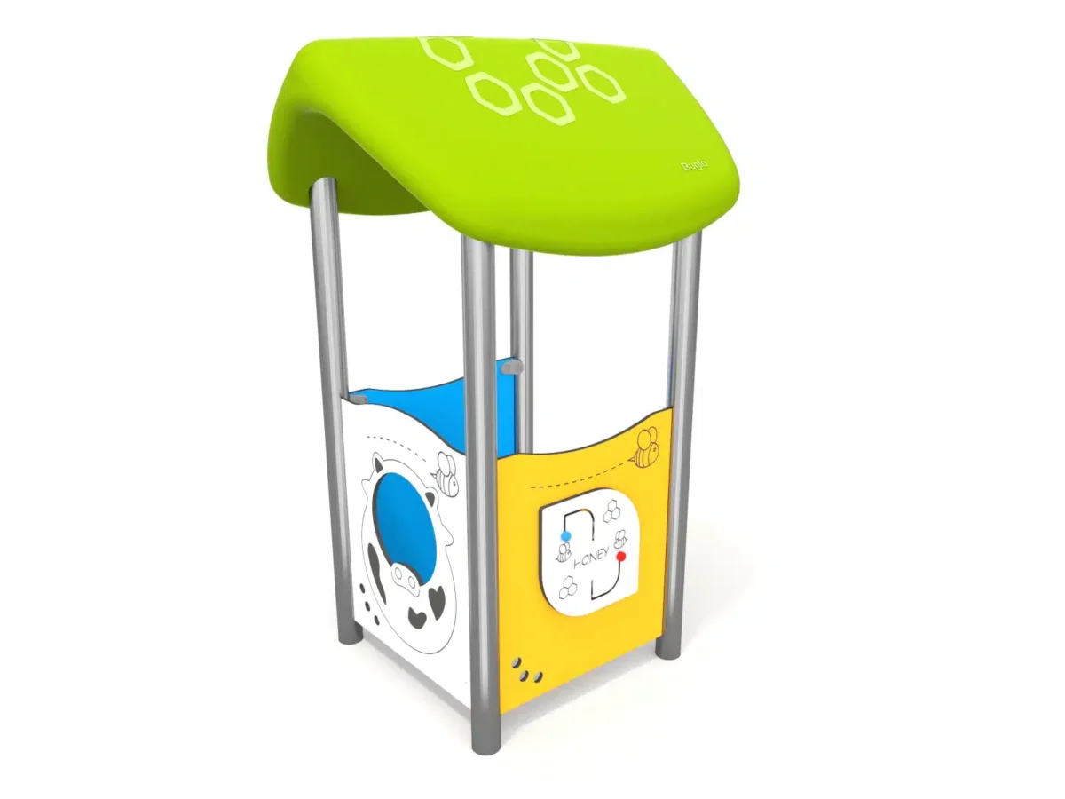 Ein junges Mädchen klettert lächelnd auf einen runden Spielplatz aus Metall und Seilen, während im Hintergrund Bäume und Grünflächen zu sehen sind.