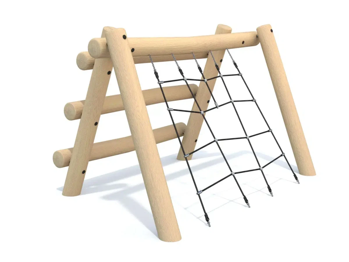 Ein junges Mädchen klettert lächelnd auf einen runden Spielplatz aus Metall und Seilen, während im Hintergrund Bäume und Grünflächen zu sehen sind.