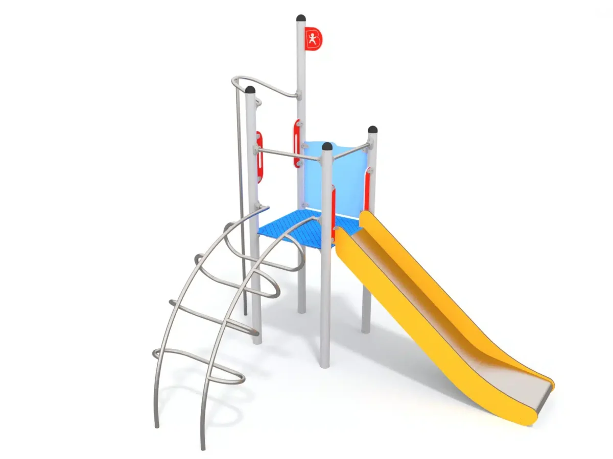 Ein junges Mädchen klettert lächelnd auf einen runden Spielplatz aus Metall und Seilen, während im Hintergrund Bäume und Grünflächen zu sehen sind.