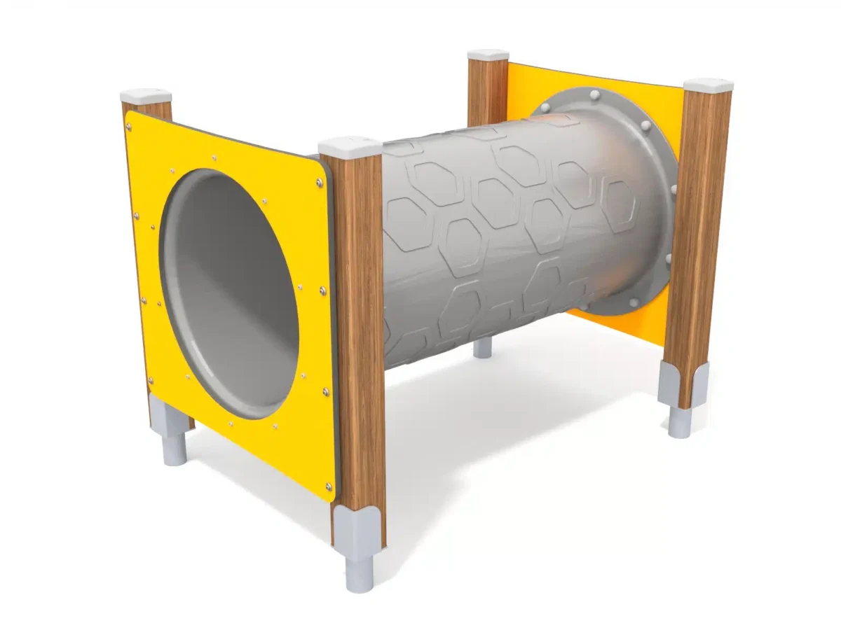 Ein junges Mädchen klettert lächelnd auf einen runden Spielplatz aus Metall und Seilen, während im Hintergrund Bäume und Grünflächen zu sehen sind.