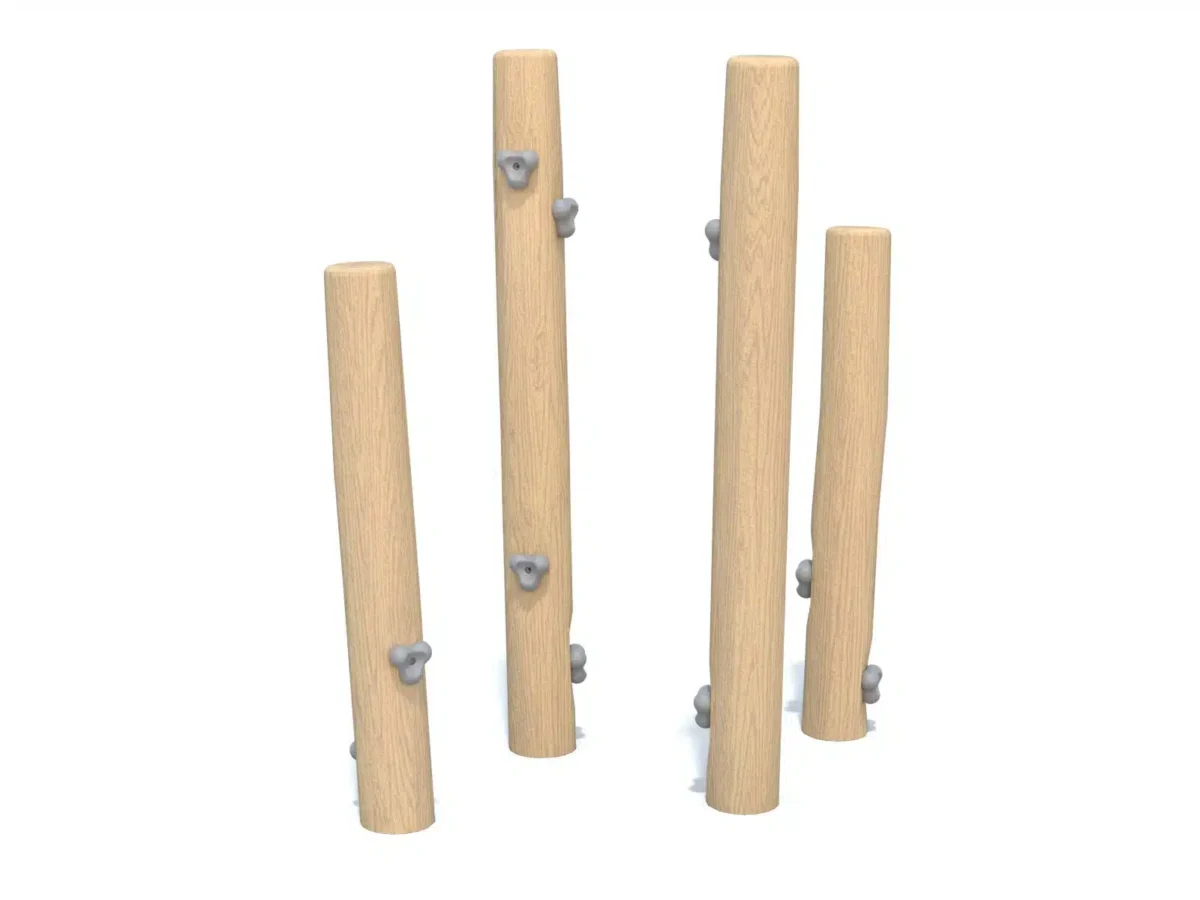 Ein hölzernes Spielplatzgebäude in Form eines Schiffes mit einem hohen Mast, Rutschen und Sand darunter. Im Hintergrund sind Bäume und ein klarer blauer Himmel zu sehen.