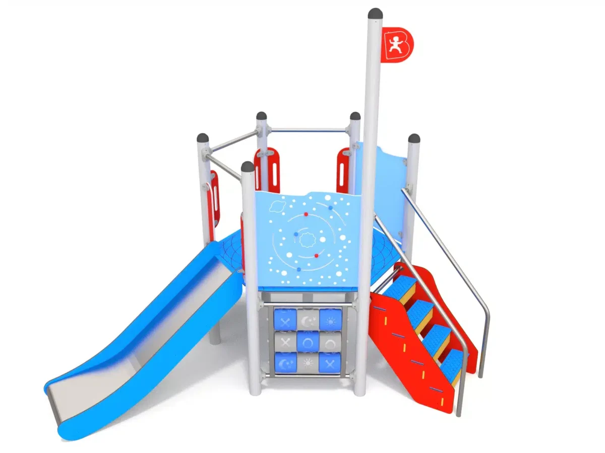 Ein hölzernes Spielplatzgebäude in Form eines Schiffes mit einem hohen Mast, Rutschen und Sand darunter. Im Hintergrund sind Bäume und ein klarer blauer Himmel zu sehen.
