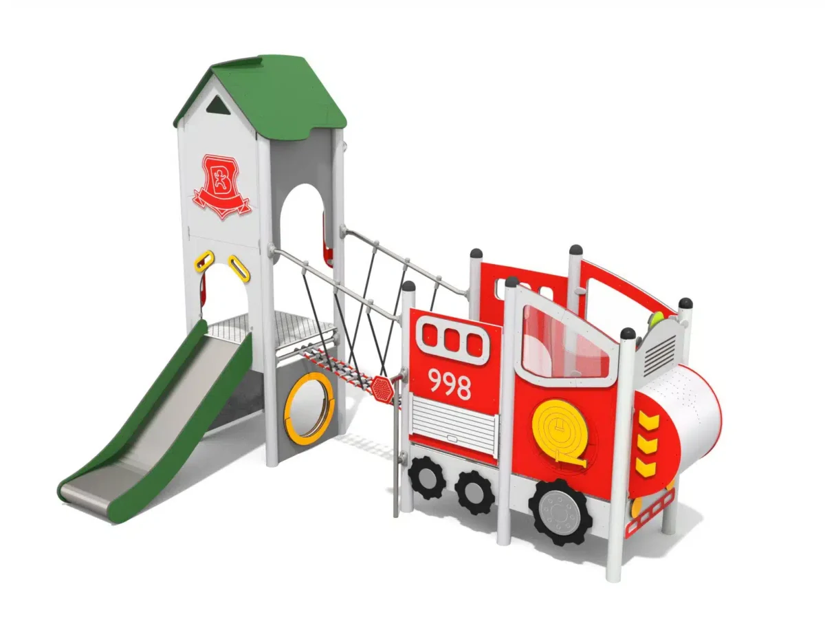 Ein junges Mädchen klettert lächelnd auf einen runden Spielplatz aus Metall und Seilen, während im Hintergrund Bäume und Grünflächen zu sehen sind.